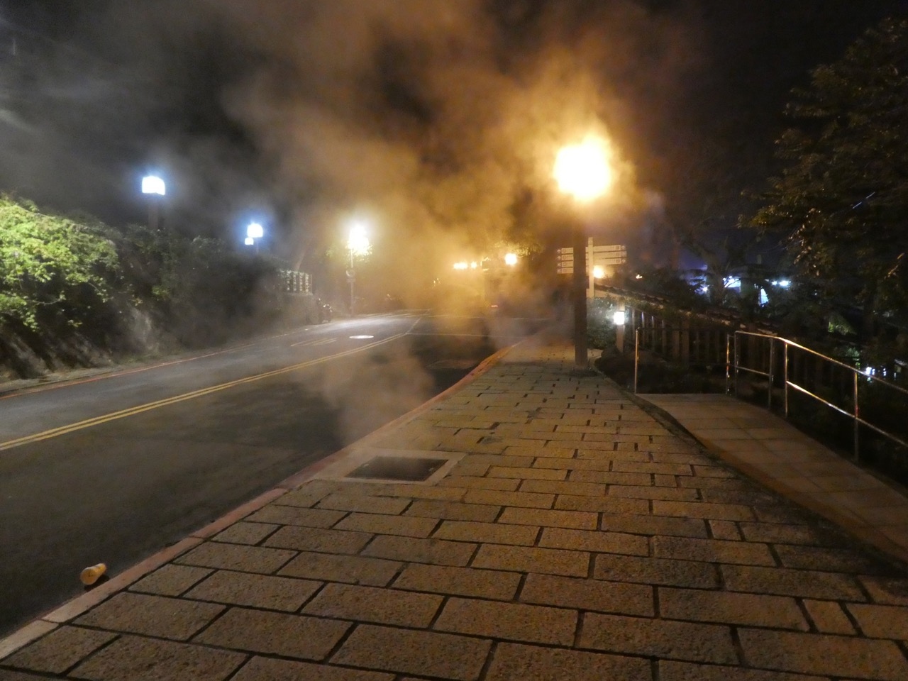 MRTの新北投支線の終点、新北投駅からすぐ。路面の下の排水溝の蓋から温泉の湯気が出てたりして雰囲気は温泉街。