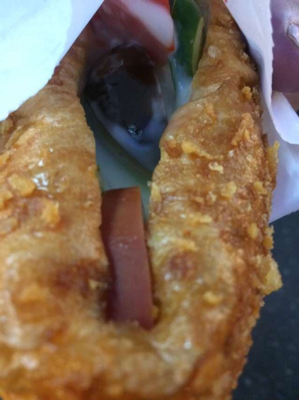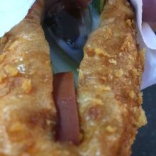 1個55元でした。揚げパンみたいなホットドッグなんですが、台湾製の甘めのマヨネーズが意外とおいしかったです。きゅうり、トマト、ピータンぽい卵、ハムなど具材も豊富に入っていました。疲れていたので、あっという間に食べきった。