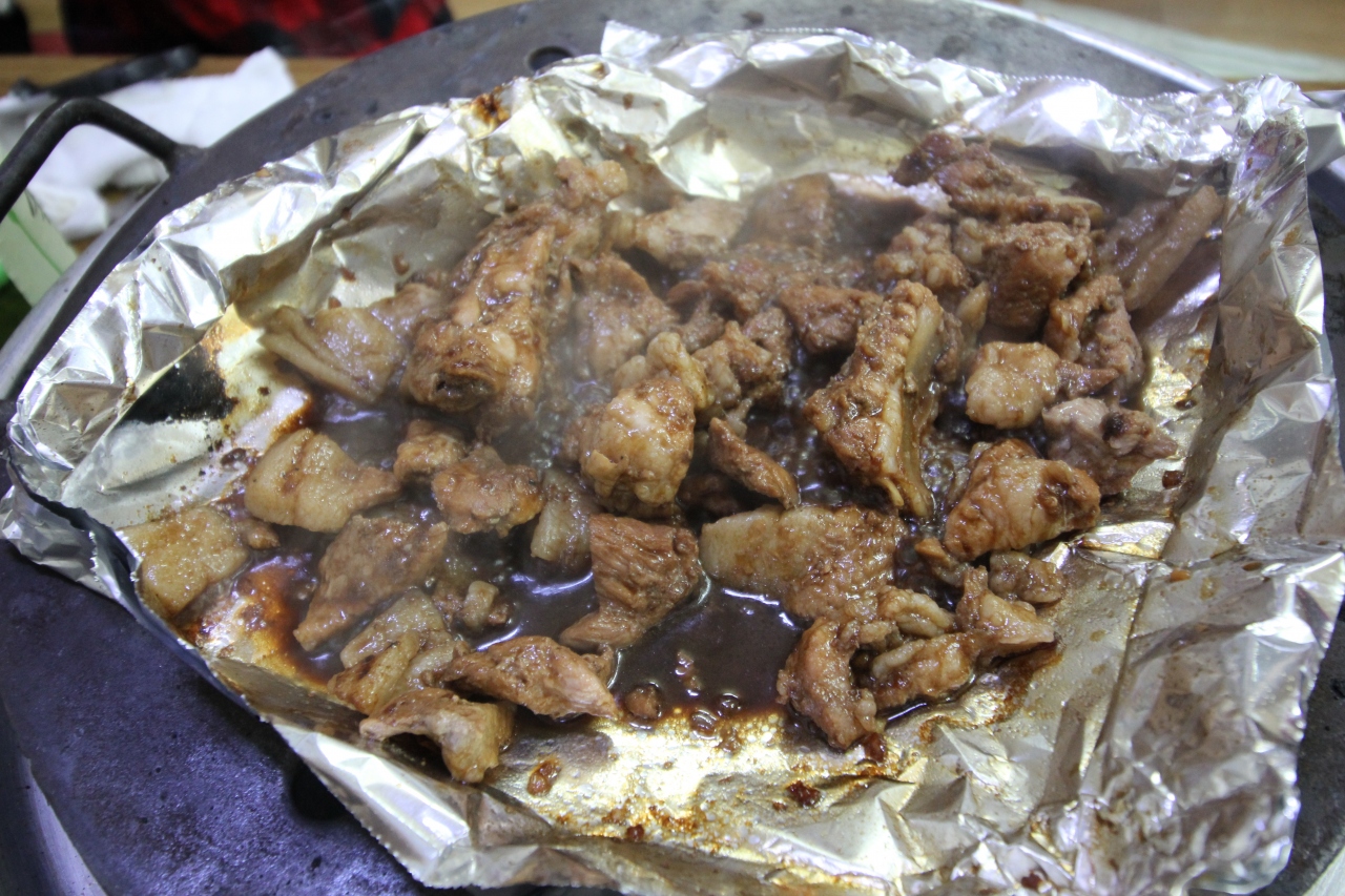 釜山駅から10分ほど、草梁カルビ通りにある釜山カルビの老舗です。アルミホイルを敷いた鉄板でタレに付け込んだ豚肉を煮詰めるように焼きます。タレがしみ込んでうまい。ごはんが進みそうですが、ビールでいただきました。