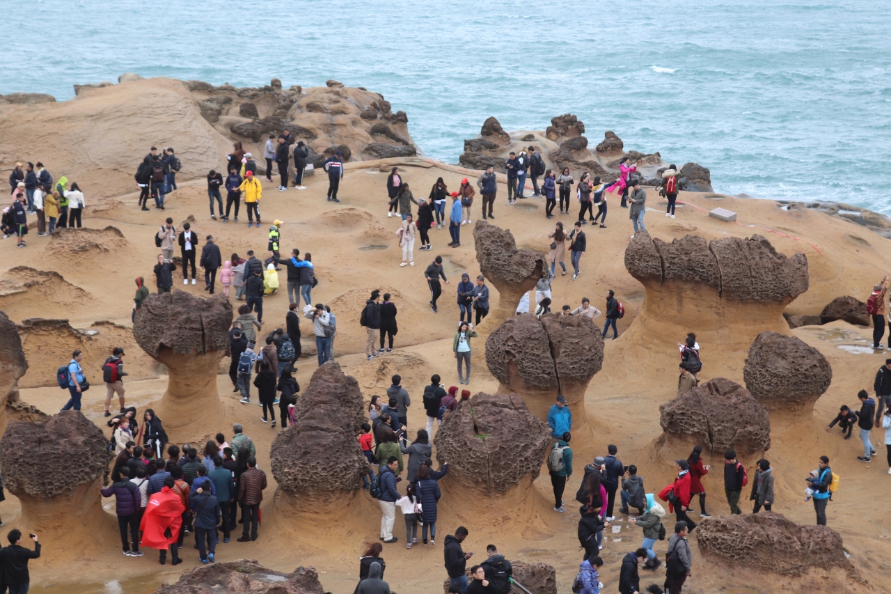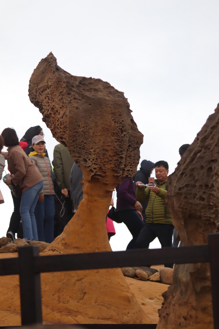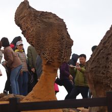 長年の波や風により浸食された奇岩が林立する海岸で、地質公園となっています。当日は強風で海岸に向かう歩道を歩くのも困難でした。しばらくすると風もやみ、海岸を周遊する遊歩道を散策しました。きのこのような奇岩がたくさんありますが、一番人気はクイーンズヘッド、女王の顔のようなシルエットで、記念写真の順番待ちでした。
