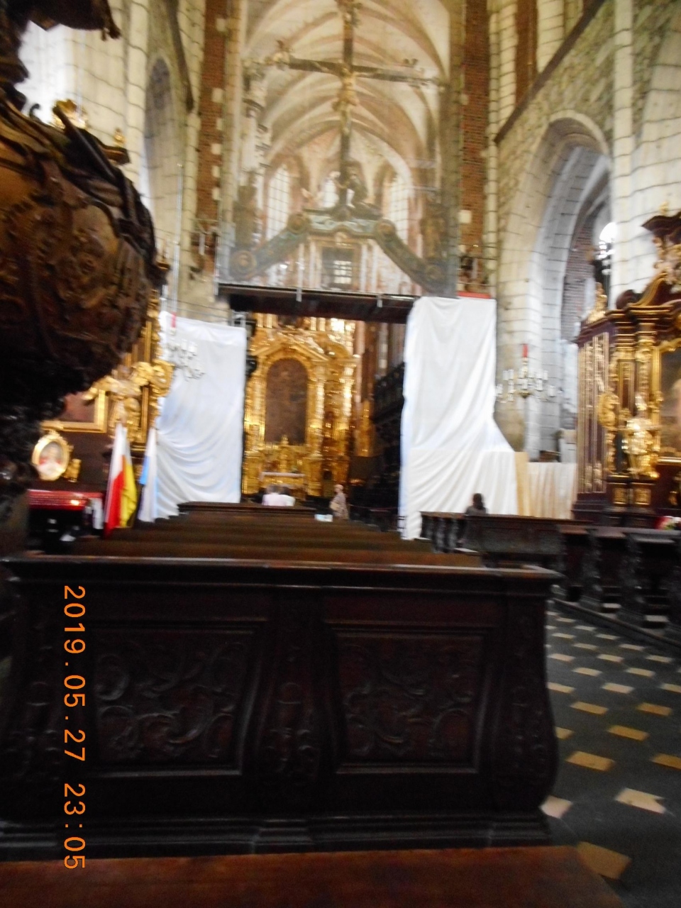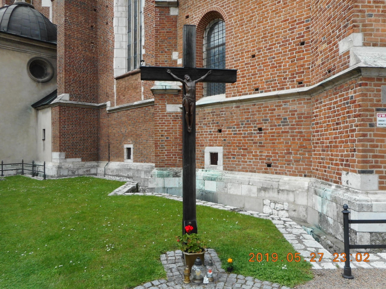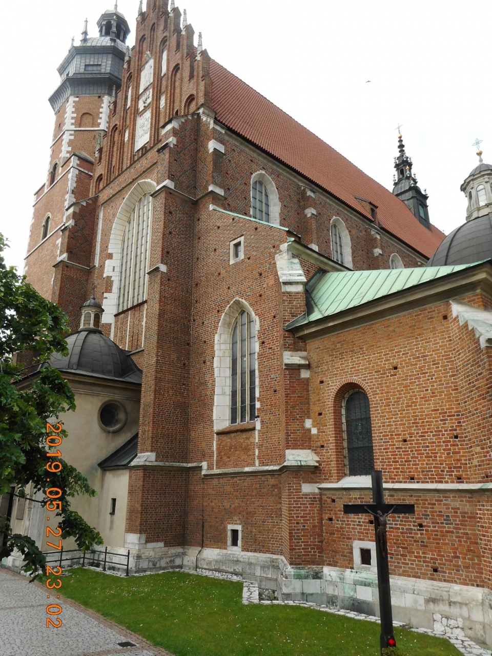 ヴァヴェル城から東南方向に徒歩10分、クラクフ民俗学博物館から東に3分のところにある、塀に囲まれた大聖堂でした。メインの建物の屋根にある2つの塔や、ちょっと変わった位置関係で建っているドーム屋根などが目立ってました。中庭には張り付けのイエスの十字架があり、建物内部は非常に天井が高く見ごたえがありました。