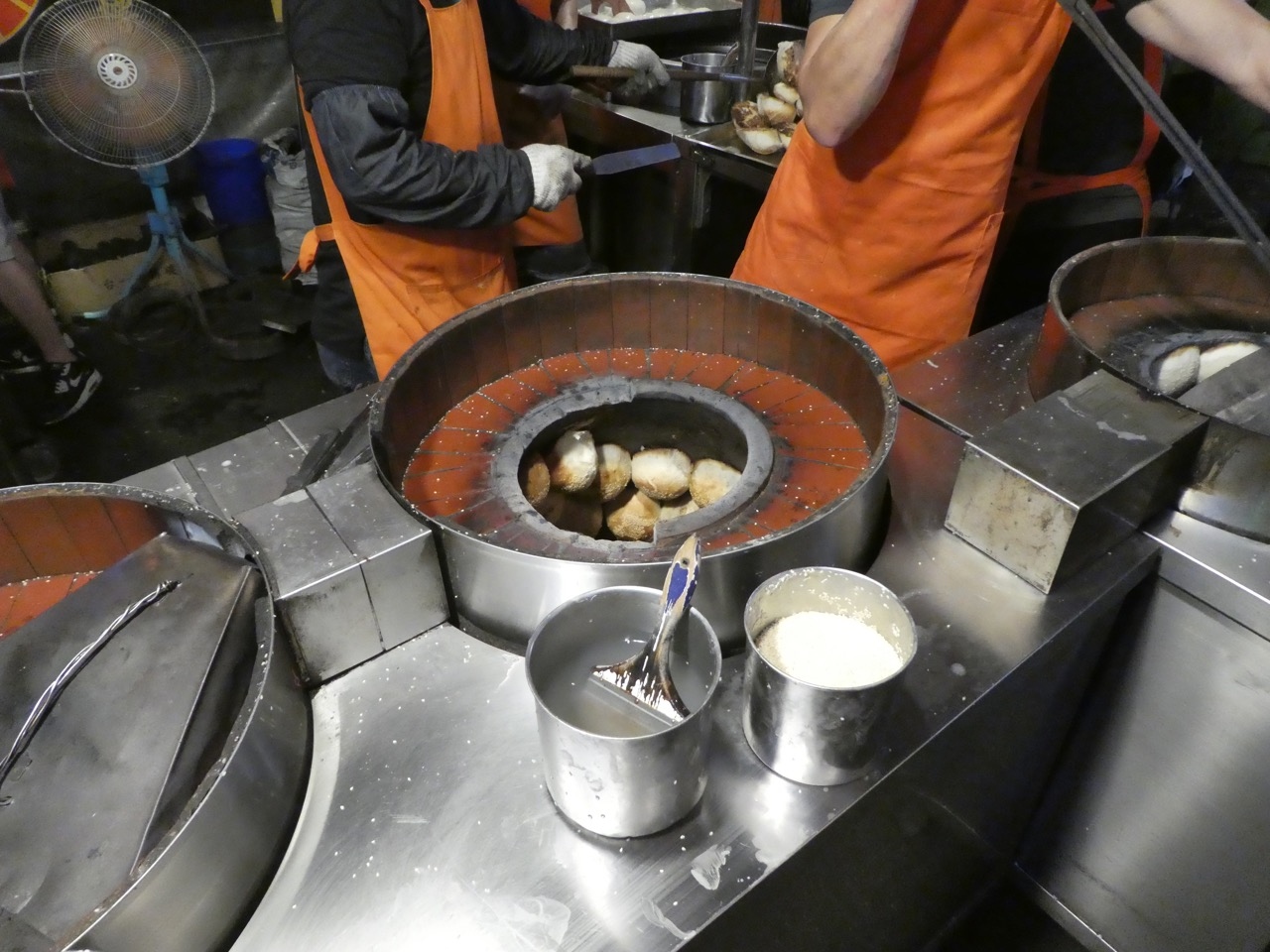 列は長くてもしょせん屋台。7~8分で入手できました。列に並んでいる間も深い鍋のような炉にくっつけて焼く、その面白い焼き方を見られるので飽きません。