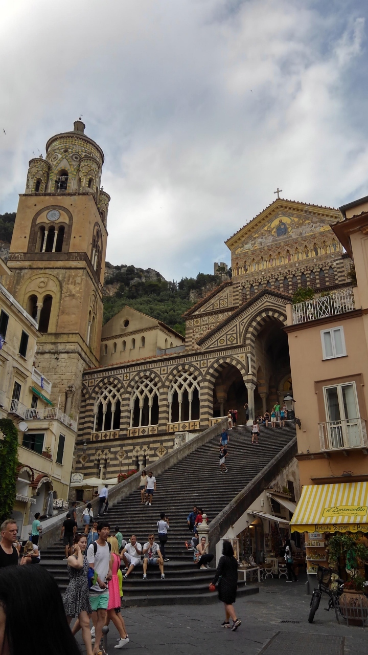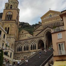 アマルフィの街の中心部のドゥオーモ広場に面しています。ドゥオーモ前には大きな階段があります。9世紀頃に建設され7回の改修により 様々な建築様式を見ることができます。ドゥオーモ正面の外壁はストライプのマーブル模様で この辺には見られない珍しい感じで 印象に残りました。隣に戦争時の見張り台だったという鐘楼も素敵です。アマルフィの街で一番の見どころだと思います。