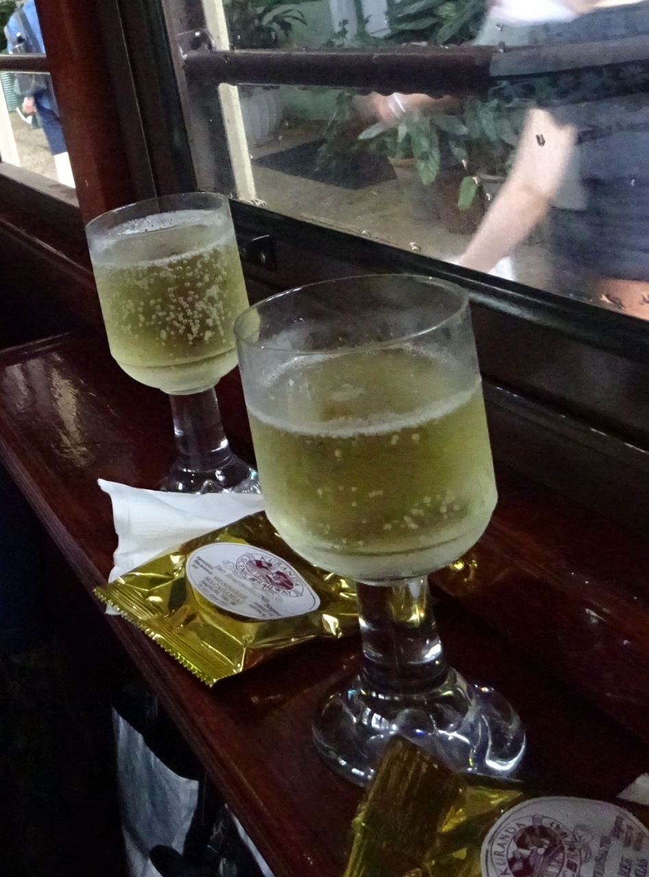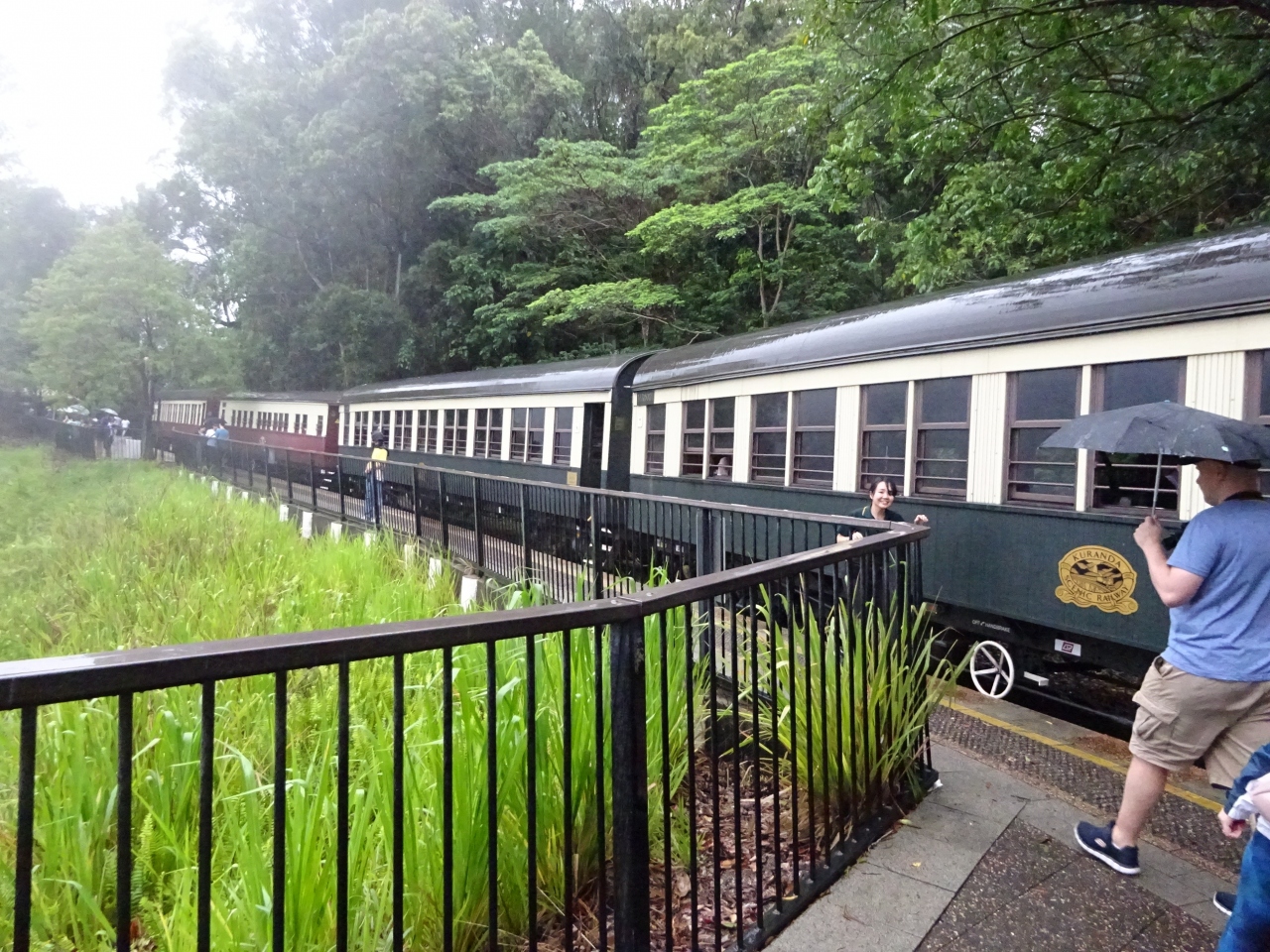キュランダツアーに参加して往路はスカイレールで、帰路にキュランダ観光列車のゴールドクラスに乗車しました。あいにくの雨交じりの空模様でしたが、ゴールドクラスのサービスでワインとチーズなどのおつまみを頂きながら、ゆっくり進む列車の車窓から風景を楽しみました。ワインはお替り時自由です。さらに乗車記念のグッズとしてボールペン、絵葉書、バッジも貰えました。