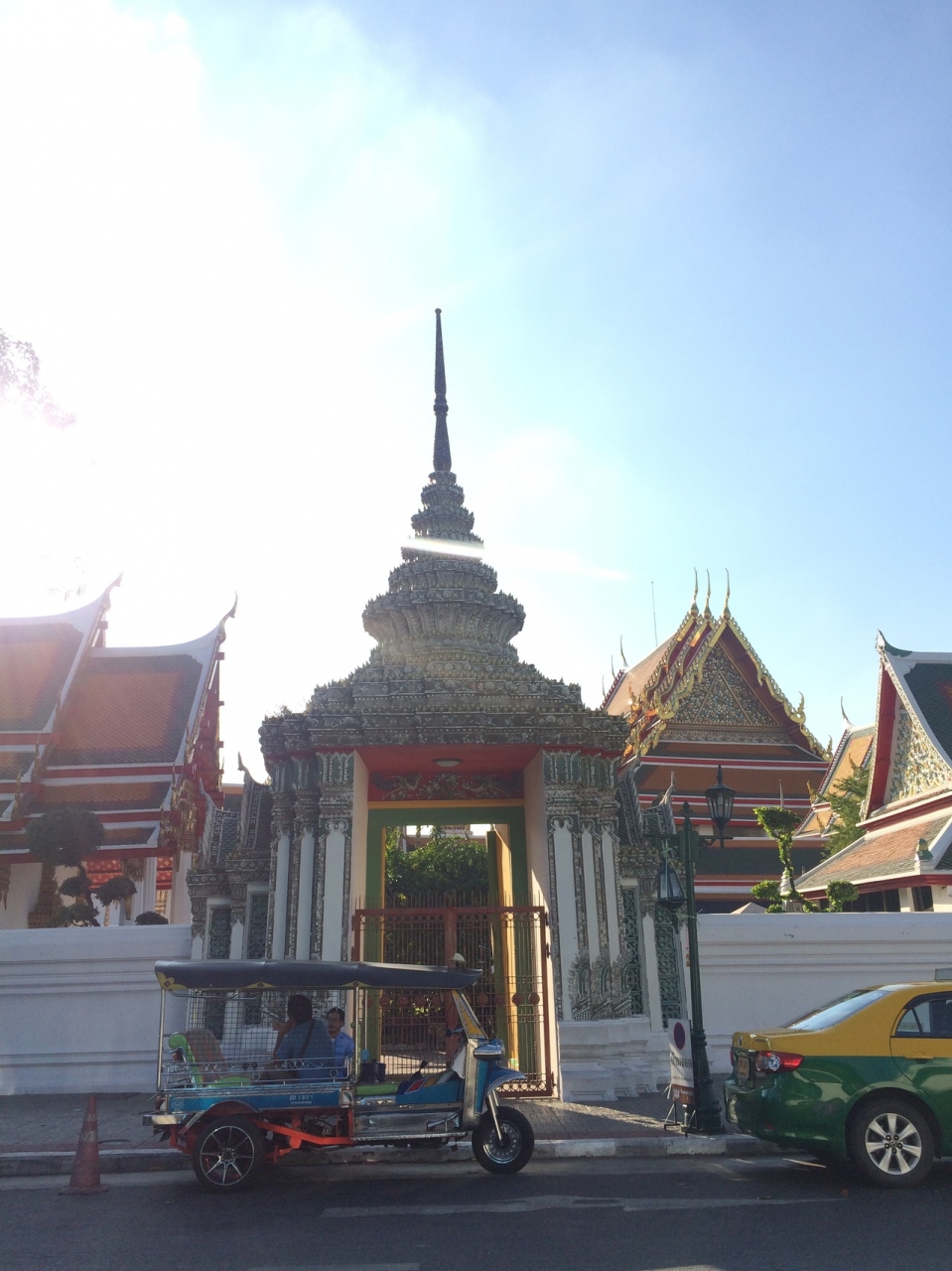中華風とはまた違うタイの特徴的な寺院で、観光客に人気があります。入場料は外国人は一律500タイバーツとタイの物価では結構なお値段でした。警備員がしっかり巡回しています。金でできた彫刻が絶妙に並んでいました。