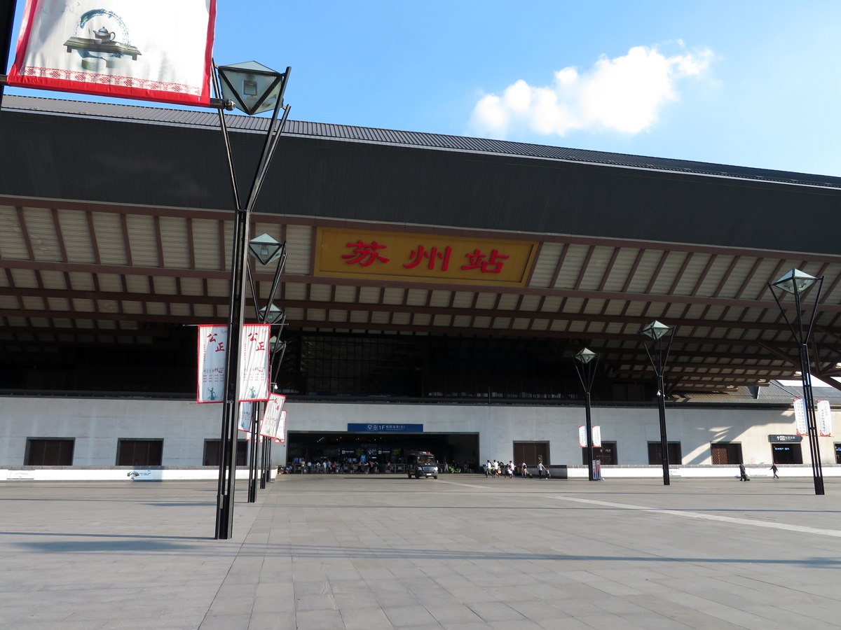 運河と庭園の街、蘇州の玄関口となる蘇州駅。高速鉄道が発着し、上海からも40分~1時間程度で来ることができます。蘇州にはもう一つ蘇州北駅という駅がありますが、こちらは高速鉄道の専用線で速度も速い列車が発着する反面、市街地から離れた駅であることもあり、本数も多い蘇州駅の利用が便利です。地下鉄も2号線、4号線が乗り入れており、観光の際の移動にも便利です。駅周辺は再開発が行われ、近代的なビルがいくらか並んではいますが、繁華街は中心部の方が栄えている印象です。駅の中に飲食店、お土産物店がありますので、そちらで十分事足りる印象でした。