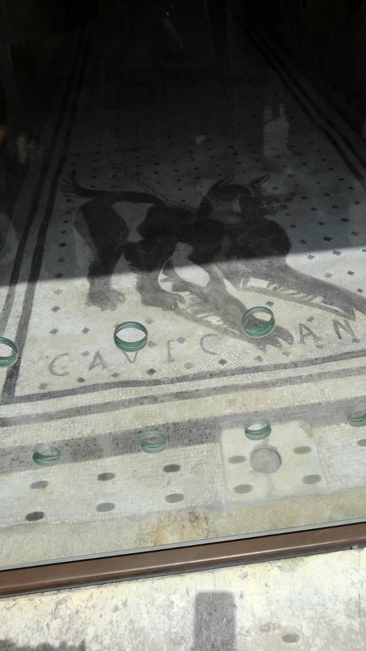 ポンペイ遺跡にあります。入口の床面には 犬の姿と「CAVE CANEM(犬に注意)」の文字が刻まれています。モザイクはガラスで保護されています。光って写真は上手く撮れないし、強い日差しに見るのも見にくい状態でした。玄関付近のみの観光でちょっと残念でした。