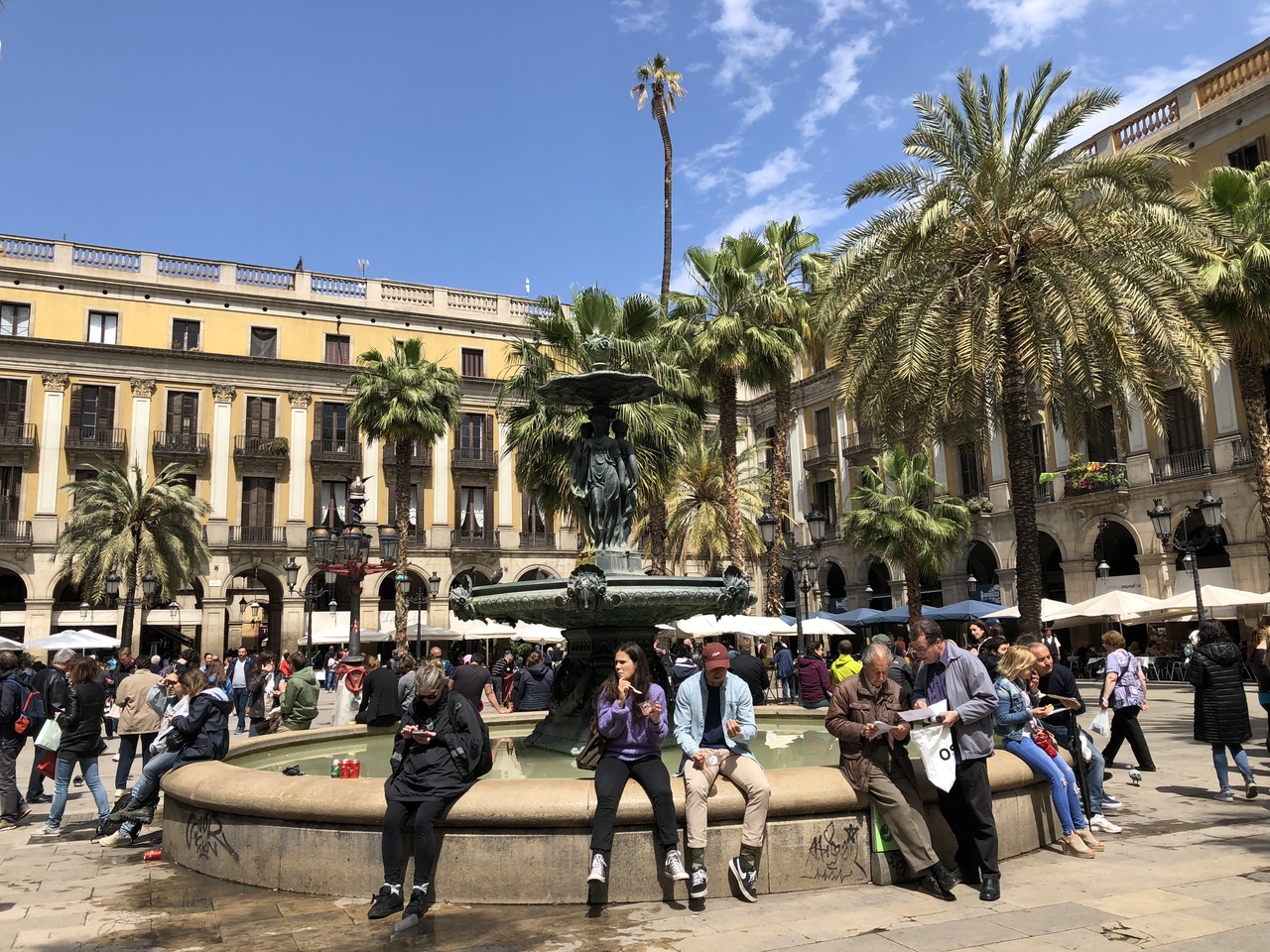 グエル邸からランブラス通りを渡ると見えてくるのがレイアール広場で、近隣住人や観光客が会話を楽しんだり、軽食をおいしく食べたりしていました。ヤシの木が多く植えてあり、中央の噴水近くに多くの人がのんびりと過ごしていたのを覚えています。観光の合間に広場に面するカフェでくつろぐにも雰囲気がいいので良いでしょう。