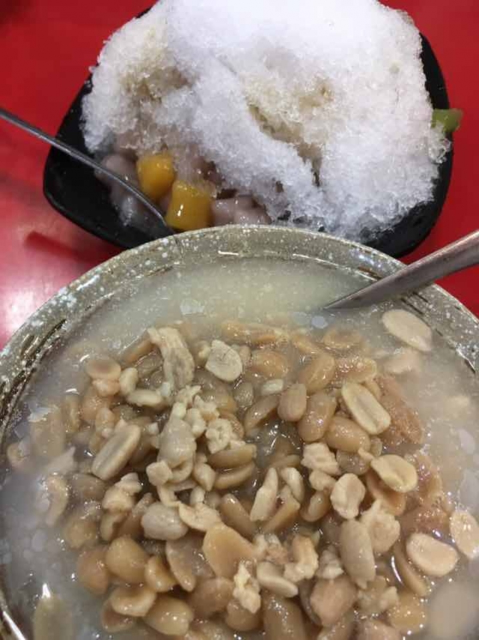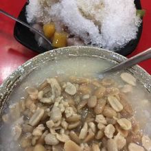 日本のよもぎのおまんじゅうみたいな色の亀型まんじゅうが売っています。中身は、ピーナッツ、あずき、ゴマの3種類ありました。かき氷も食べましたが、トッピングは3種類選べました。タロイモ団子がおいしかったです。