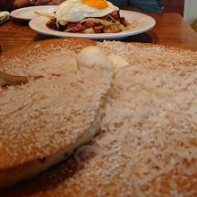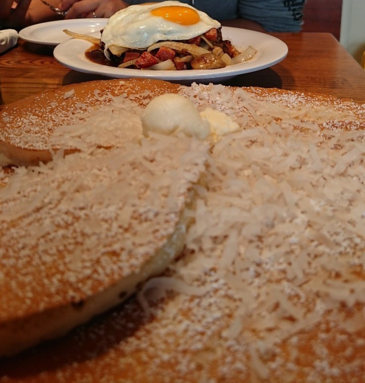 パンケーキとロコモコを妻と半分ずつにしてたべました。パンケーキはココナッツがたっぷりかかっていてとても風味がハワイアンでおいしく、生地もふっくらしていました。