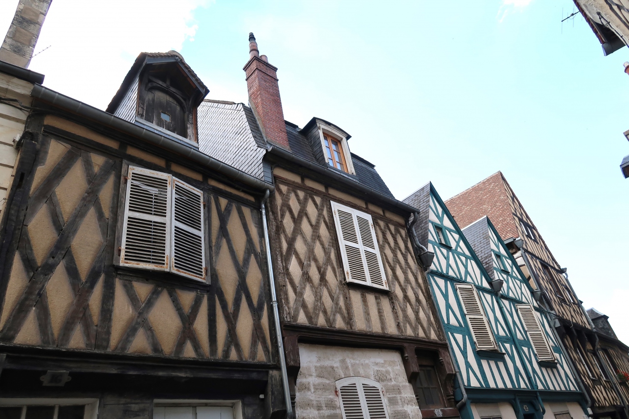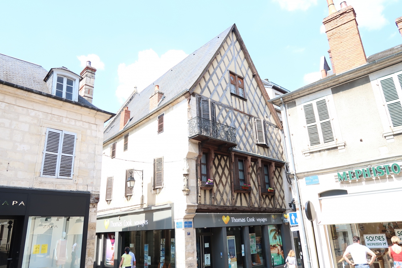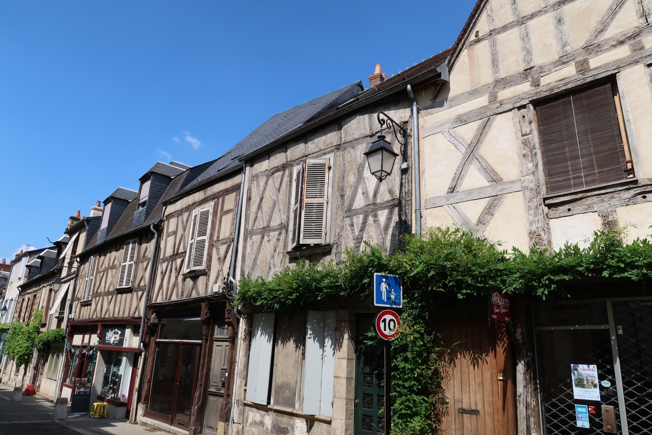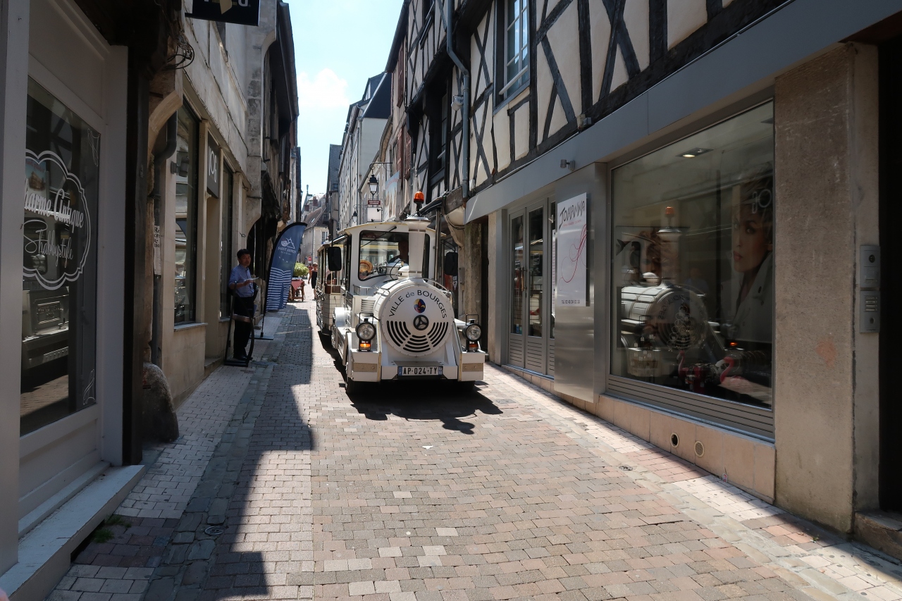 ブールジュ大聖堂から町の中心広場、ゴルデーヌ広場までを結ぶ、かつての町のメインストリートですが、今は静かな通りになっていました。中世のハーフティンバー様式の家がたくさん並んでいて、絵になる風景です。さらにブルボヌー通りと交差するRue Coursarlonにも半木骨造の家が並び、商店街のようになっていて、観光列車も走っていました。中世の街並み散策なら、活気のあるゴルデーヌ広場からRue Coursarlonの方がおすすめです。