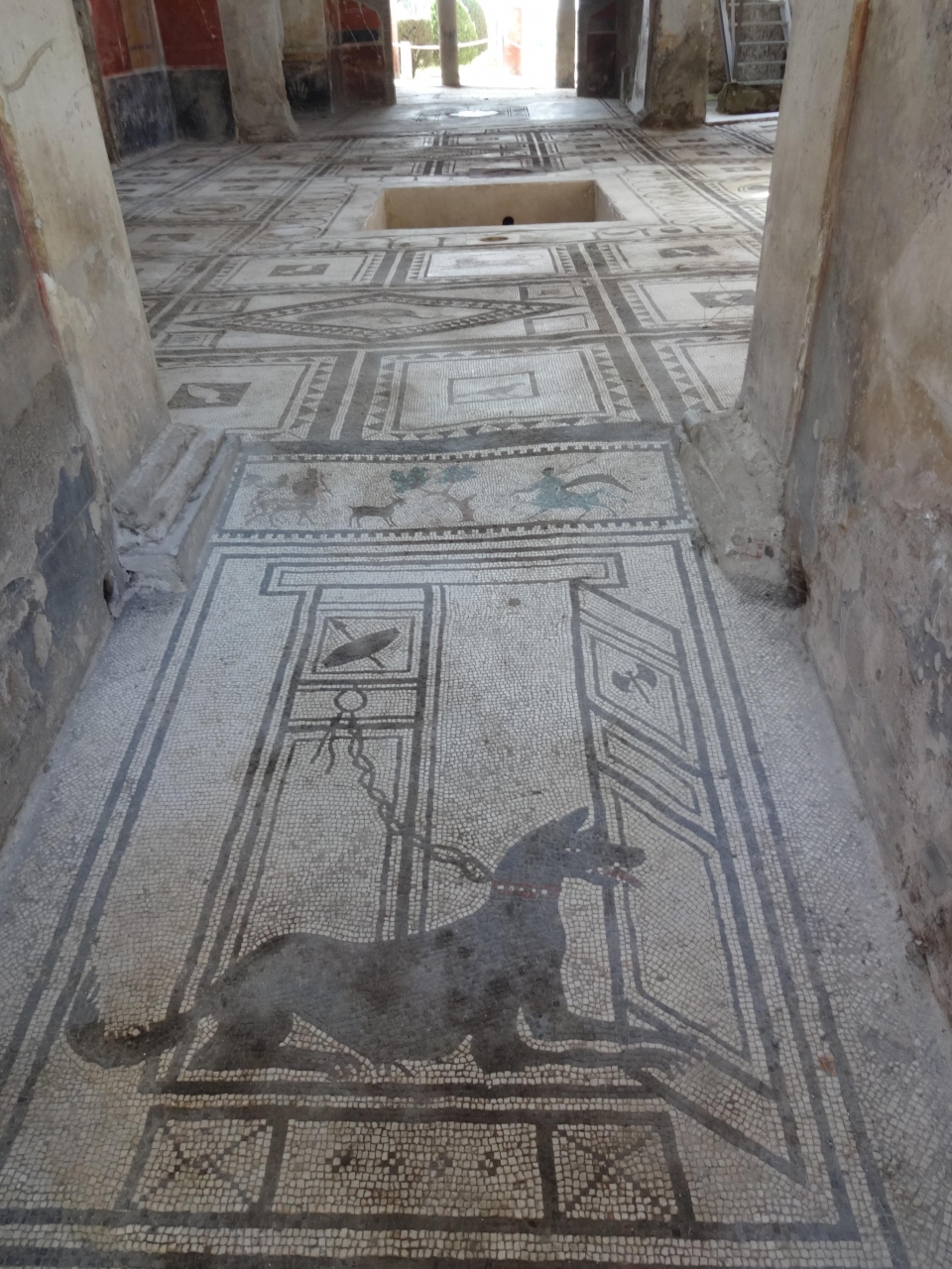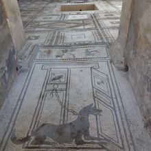 玄関に「ジョジョの奇妙な冒険」(小生は見たことはないが)のワンシーンで有名な「猛犬注意」と刻まれたモザイクの「犬の床絵」があった。玄関に犬のタイル絵を取り入れるのがはやっていたのであろうか?ここ以外にも、犬の床絵がある家はポンペイ遺跡内のあちこちにあった。この建物の入り口は鉄柵が施され施錠されて中には入れないようになっていて、写真が撮りづらかったので、他家の写真で代替。