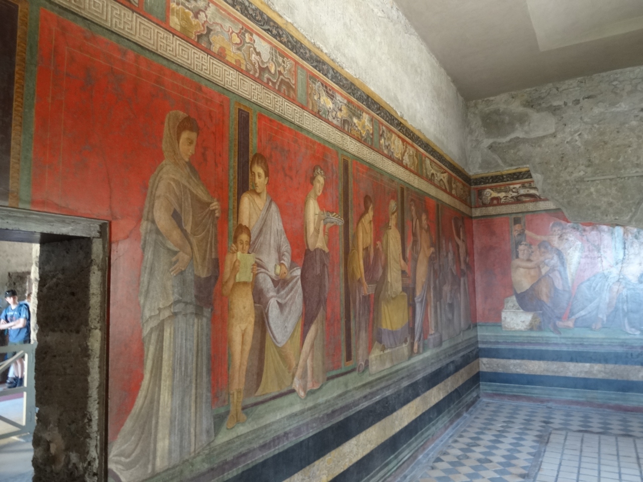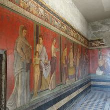 当時禁止されていたディオニソス信仰に関わる儀式を秘密裏に行っていたとされる建物。そのため遺跡から少し離れた北西の端にある。壁には、秘教入信のための儀式の様子が、「ポンペイの赤」と呼ばれる濃紅色を多用して描かれていた。