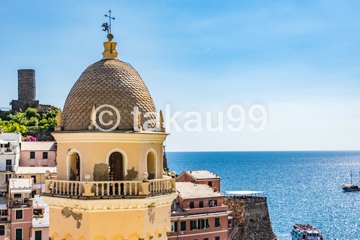 ジェノヴァから鉄道を使って日帰りで行きました。世界遺産にもなっているチンクエテッレのヴァルナツァの港にある教会です。周りにある海や港、山などと一体になった文化的景観が素晴らしいです。高台から見下ろす構図もイイです。