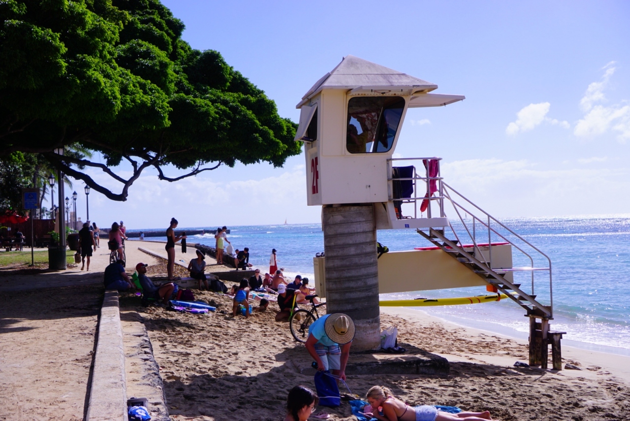 ワイキキビーチが混んでいるので、私はいつもカピオラニビーチまでいきます。芝生もあるし、のんびりした感じもお気に入りです。ただ砂浜の幅が満ち引きで狭い時がありますので、そういう時は歩道を越えて芝生でのんびりもなかなか乙です。