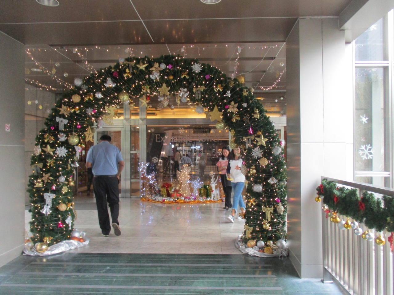 クリスマスの時期にエクスチェンジタワーに訪問しました。エクスチェンジタワーオフィスはビルなのですが、それでもエントランスに凝ったクリスマスの飾りが置いてありました。エントランスは人が通れるくらいの大きいリースが飾られていて記念にくぐりました。