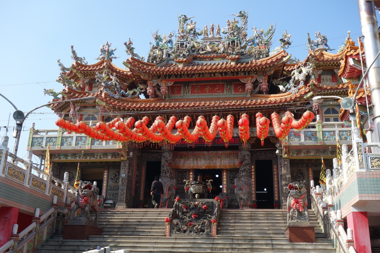 高雄に滞在中こちらの場所を訪れました。左営下路と元帝路の角に位置する立派な御廟で蓮池譚上にいらっしゃる北極玄天上帝に関係しています。御廟は石段の上に位置する立派なもので特に装飾は色彩豊かで見事なものでした。