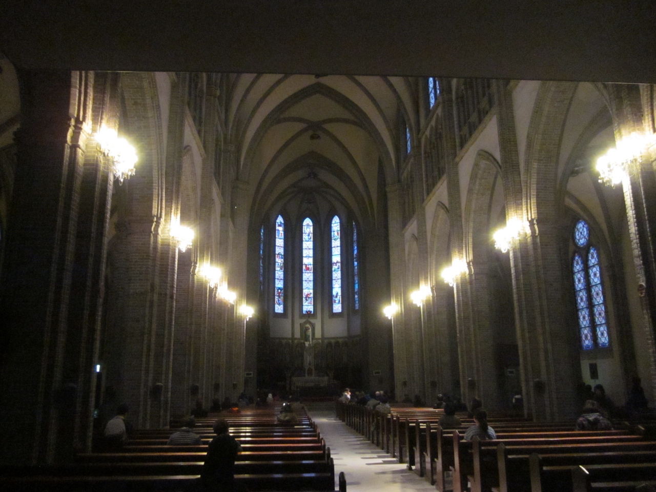 ミョンドンのメイン通りから徒歩で5分程なので、本当に都会の真ん中にある教会です。教会内は、ステンドガラスが綺麗で、天気の良い日は、日差しが射し込むと綺麗です。この日は、曇り空でしたので、残念です。
