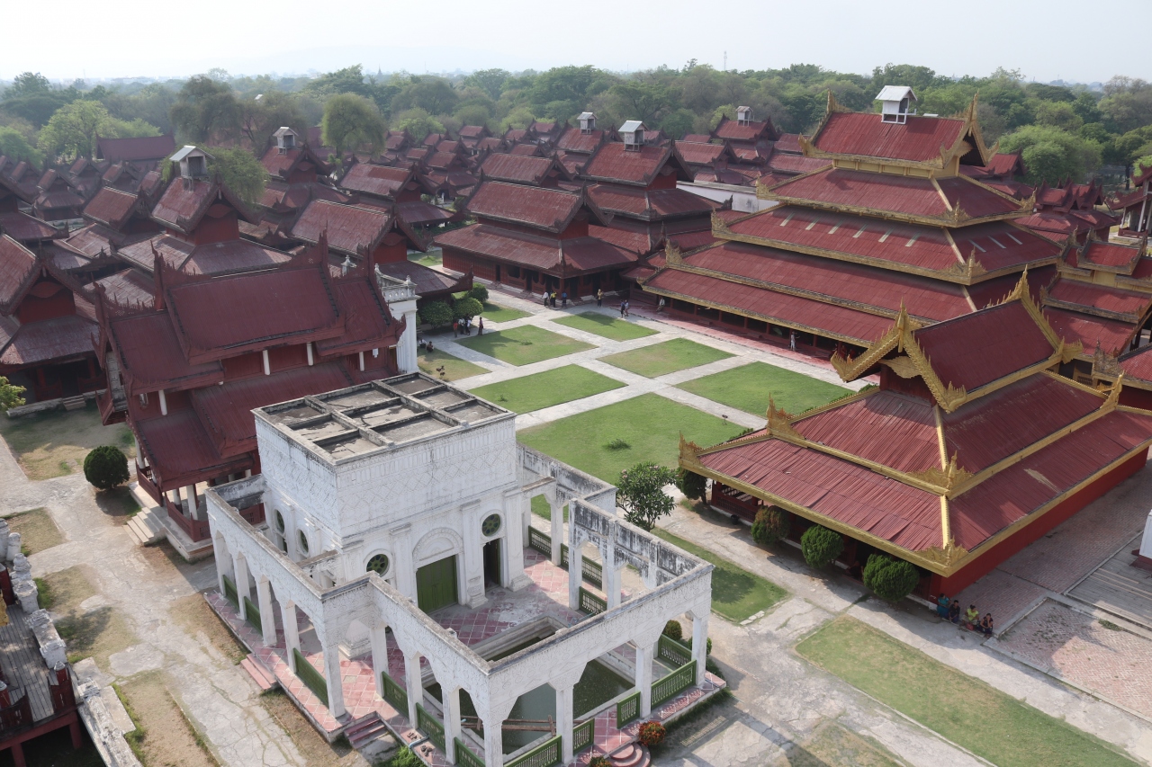 マンダレーの町の中央にある四方3キロの広大な敷地跡で、高さ8メートルの城壁で囲まれています。外国人観光客の入口は制限されており、町からは三輪タクシーとバイクタクシーを乗り継いで、入口に到着しました。円筒形の監視塔からは全景が見渡せました。