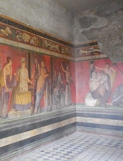 最大の見どころはデュオニソスの秘儀をテーマにした「秘儀の間」の壁画。「ポンペイの赤」と言われる深い赤の色を目に焼き付けました。