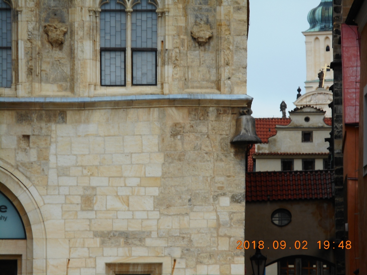 旧市街広場を取り囲む建物がたくさんあったのですが、石の鐘の家もそのうちの一つでした。ガイドブックを読んだ時は意味が分からなかったのですが、「百聞は一見に如かず」のことわざの通りでした。ヤン・フス像の南隣辺りに立って東側の建物を見ると、キンスキー宮殿の右隣の建物の右端にありました。