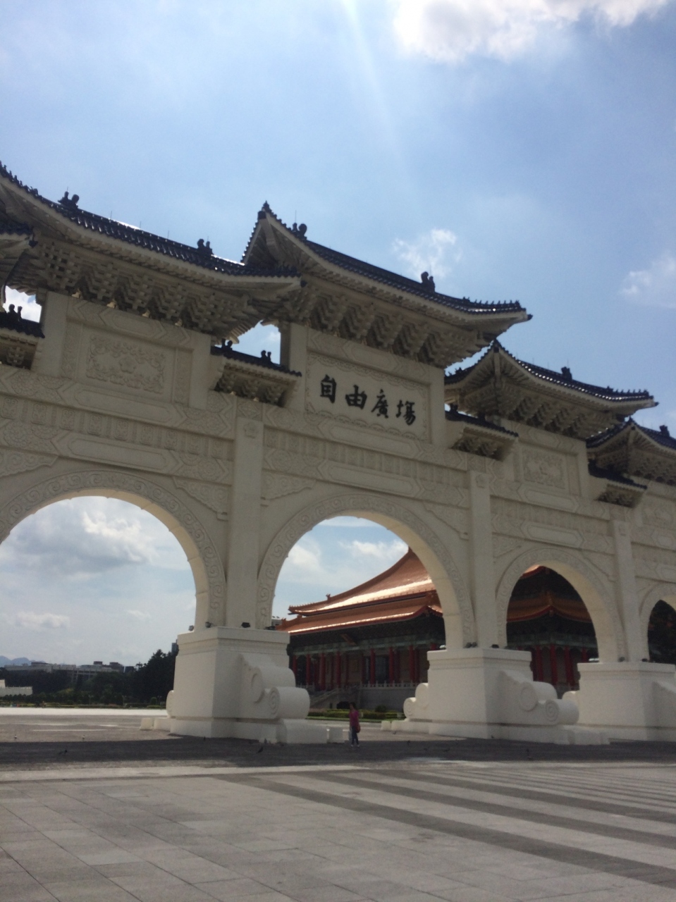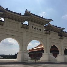 見上げるくらい高さのある門です。白塗りで、夜はライトアップされています。門の真ん中に立つと、中正紀念堂がちょうど真ん中に見えます。一直線でつながっている様子は、実際に見ると結構圧巻です。ちらほら、市民が散策していました。