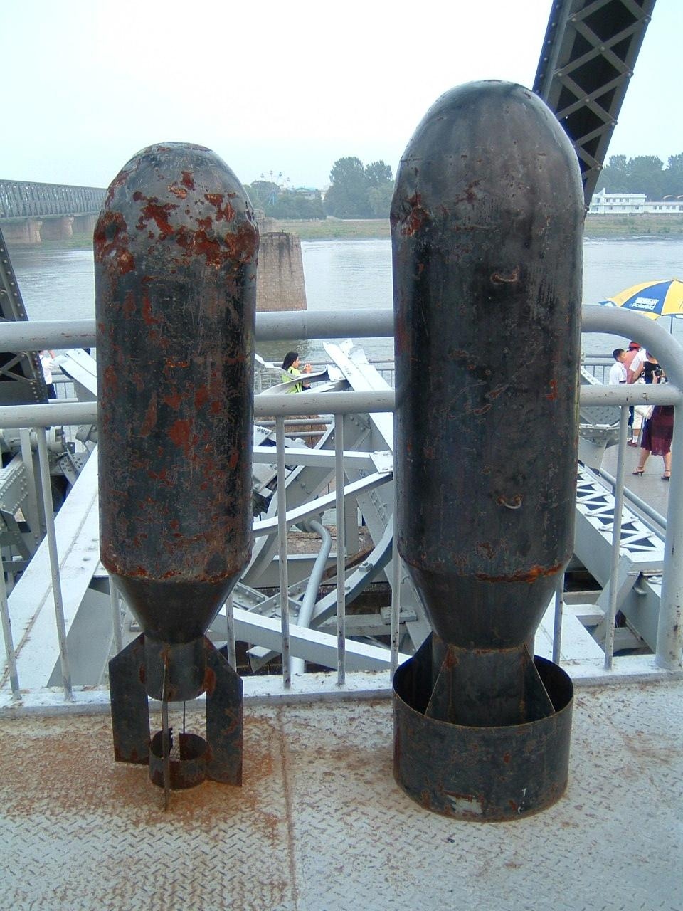 「壊れた橋(鴨緑江(断)橋)」の前には朝鮮戦争時、米国機の爆撃に使われた(元々不発弾でしょうか)爆弾が無造作に橋の上に展示されています。