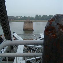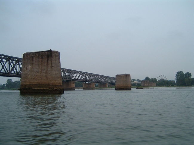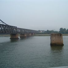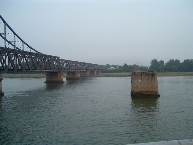 鴨緑江には2つの橋が横に並んで架かっています。一本は今でも現役のもの。もう一本は半分だけでその先は橋桁のみ。