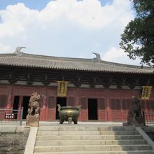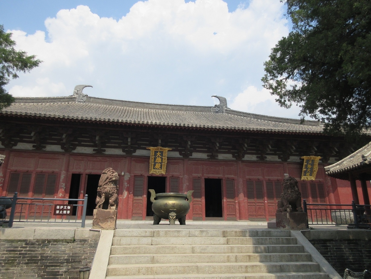 1961年に全国重点文物保護単位(国宝)に指定された、遼代を代表する木造建築の一つがこちらです。中国の古建築を研究した建築家の【梁思成】が絶賛した仏殿は、単層木造構造の建物では最大規模の物で、3mの基台の上に建つその姿は、優美で落ち着いた佇まいを見せていました。外から堂宇を眺めれば、寄棟造りの屋根とその上の鴟尾が、日本の古建築の原型を思わせます。堂宇の中に入ると、柱と梁が複雑に組み合わさった建築美には思わず息をのみました。