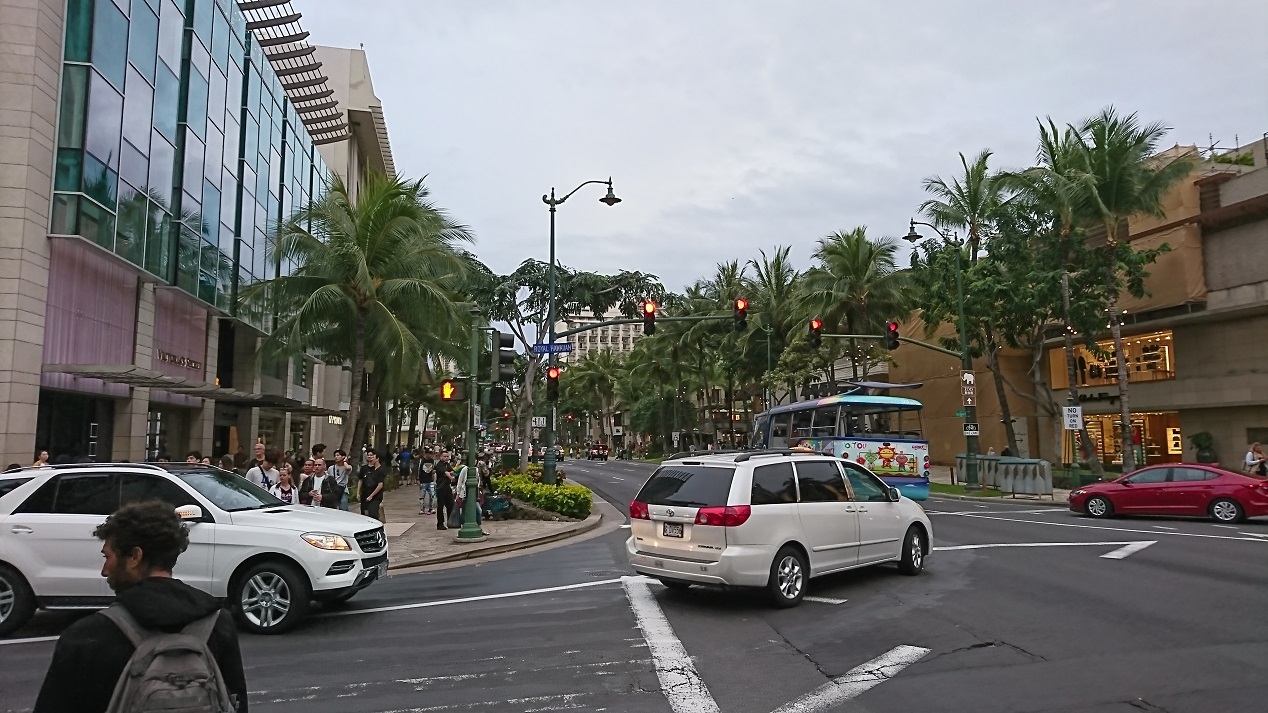 オアフ島ワイキキのメインストリートがカラカウア通りです。カラカウア通りを最初に歩いたのは30年ほど前ですが、その時と比較するとだいぶ進化していて、現在ではブランドショップやお洒落なレストランが並んでいます。新しいショッピングモールも次々に誕生していて、まさにワイキキの目抜き通り。ホノルル観光では必ず歩いておきたい通りです。