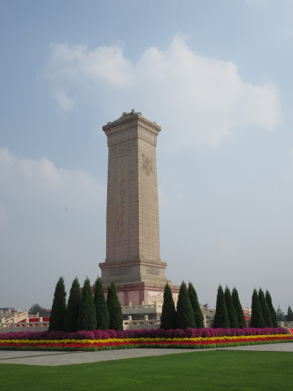 天安門広場の中心にあり、毛沢東の筆による【人民英雄記念碑】の文字が刻まれた巨大なモニュメントです。中国革命で命を落とした多くの兵士らを讃える石碑で、天安門事件の際に、大勢の市民や学生らがこの碑の周りに集う姿が印象的でした。今でも、各種行事の際に政治指導者が献花する場所のため、ニュース等で目にすることも多いです。