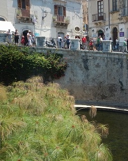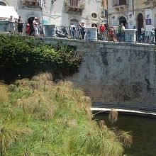 アレトゥーザの泉はオルティジャ島の西海岸近くにあります。シラクーサの有名スポットの一つで、パピルスの茂った泉をたくさんの観光客がのぞき込んでいます。