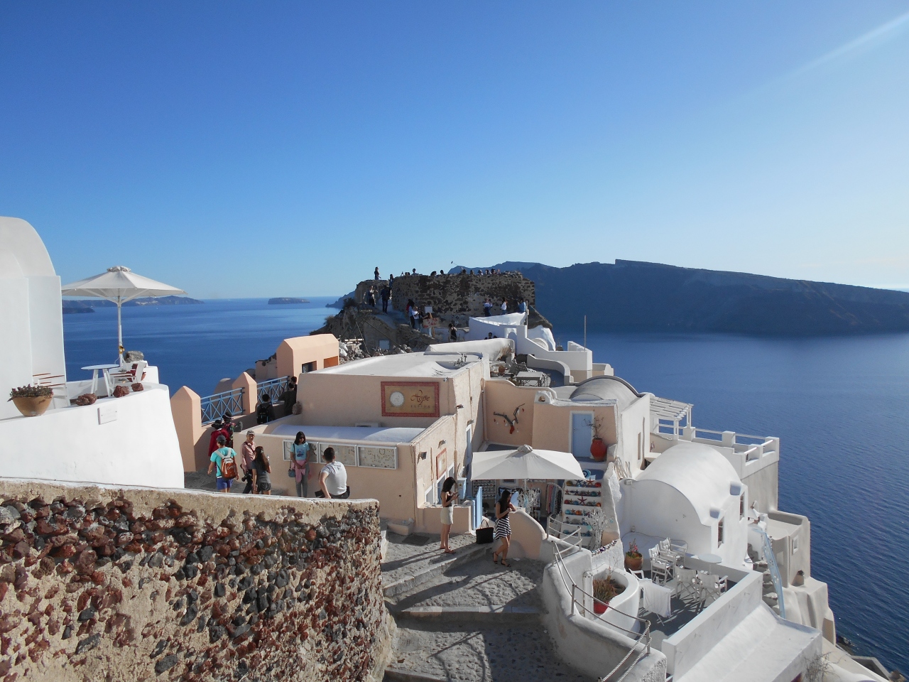 イアの南端にある5世紀に建設されたイア城の遺跡です。城の土台部分しか残っていませんが、サントリーニ島のパノラマの景色を楽しむことができます。西側には風車の町並み、南側には青い海と断崖、東側には青いドームの教会を望むことができます。