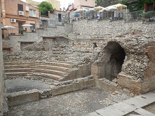 サンタ・カテリーナ教会は、メーシッナ門を入ってすぐのところにある小さな教会です。古代ギリシァ時代・ローマ時代の遺跡の上に建てられていて、教会の裏手に行くと、ローマ時代のオデオンの遺構を見ることができます。