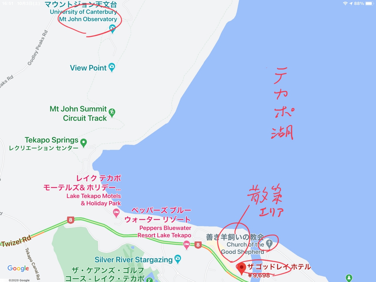 テカポ湖畔のゴッドリーホテル周辺の地図、