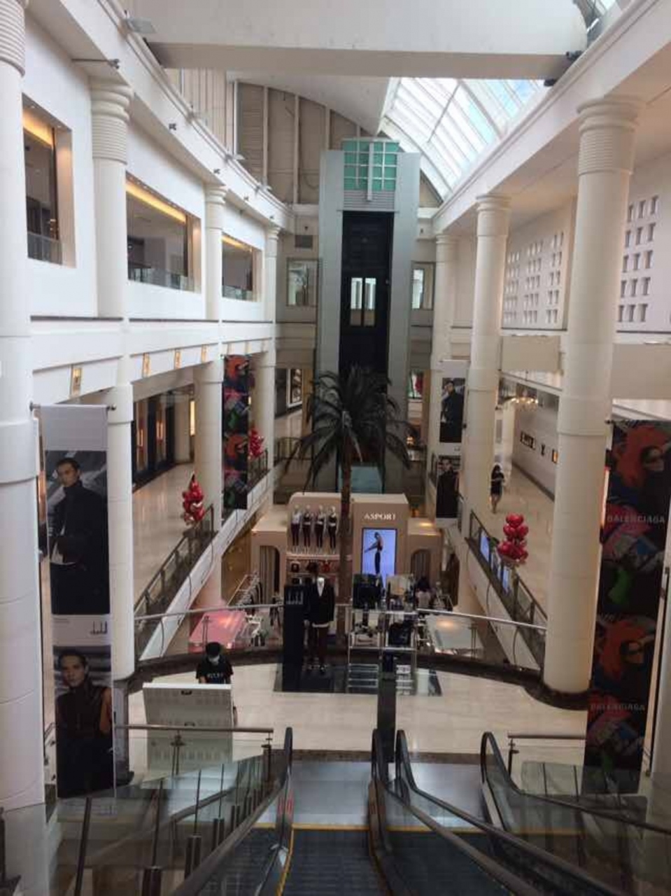 空間を上手に利用した大きなショッピングモールでした。入り口もガラス自動ドアで、高かったです。地下にはスーパーがあり、おいしそうな輸入のスモークハムやベーコンが売っていました。日本の緑茶やチョコレートもありました。