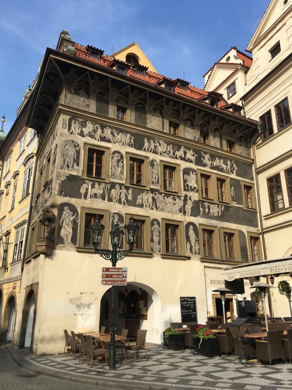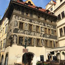 旧市庁舎の端にある建物で、通りに面して不思議な角度で建っているので見逃し要注意です。外壁にはシックなだまし絵が描かれていて、ぱっと見、彫刻かと思うような雰囲気のデザインでした。