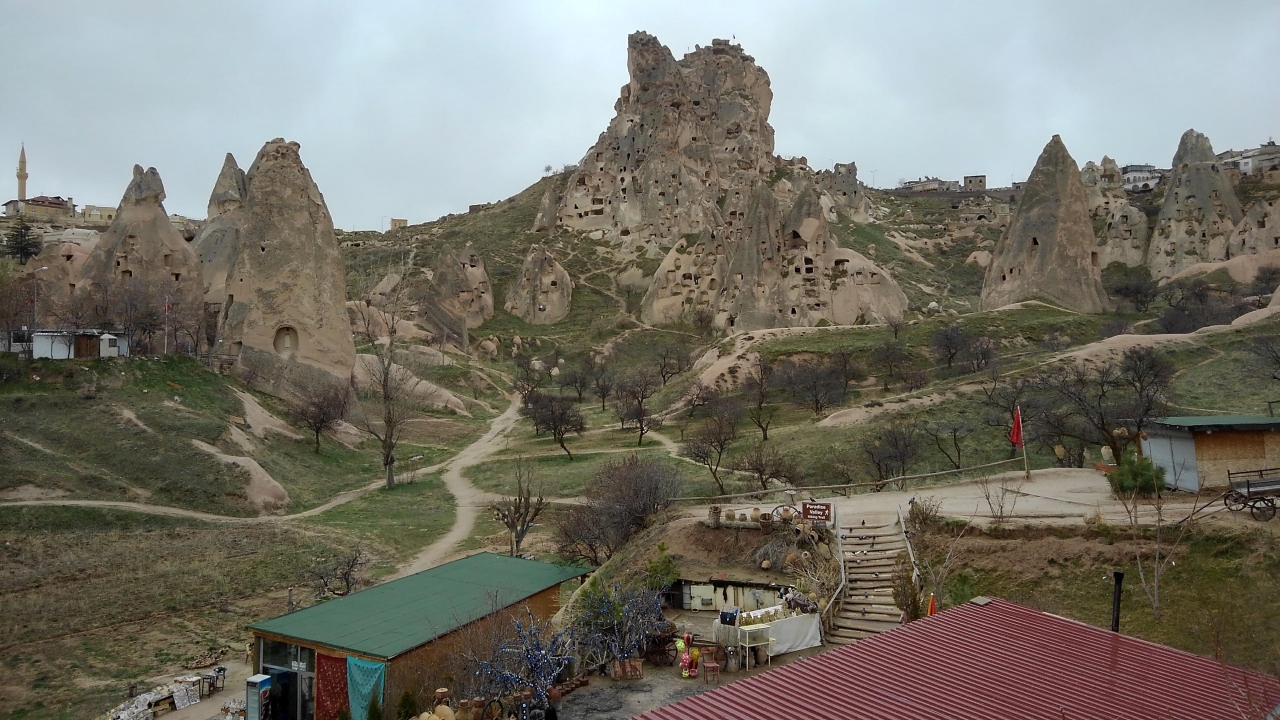 ウチヒサルは、巨大な岩山をくり抜いて造られたウチヒサル城を中心に広がる村です。トルコ語で「尖った砦」という意味だそうです。古代ローマ時代に、ギリシャ人キリスト教徒が迫害から逃れて、ここに隠れ住んだことに始まったとのことです。城から続く奇岩群と、観光とかかわりを持ちながらの暮らしを垣間見たり、生活と一体化した民家などが並ぶ風景に感嘆し続けました。