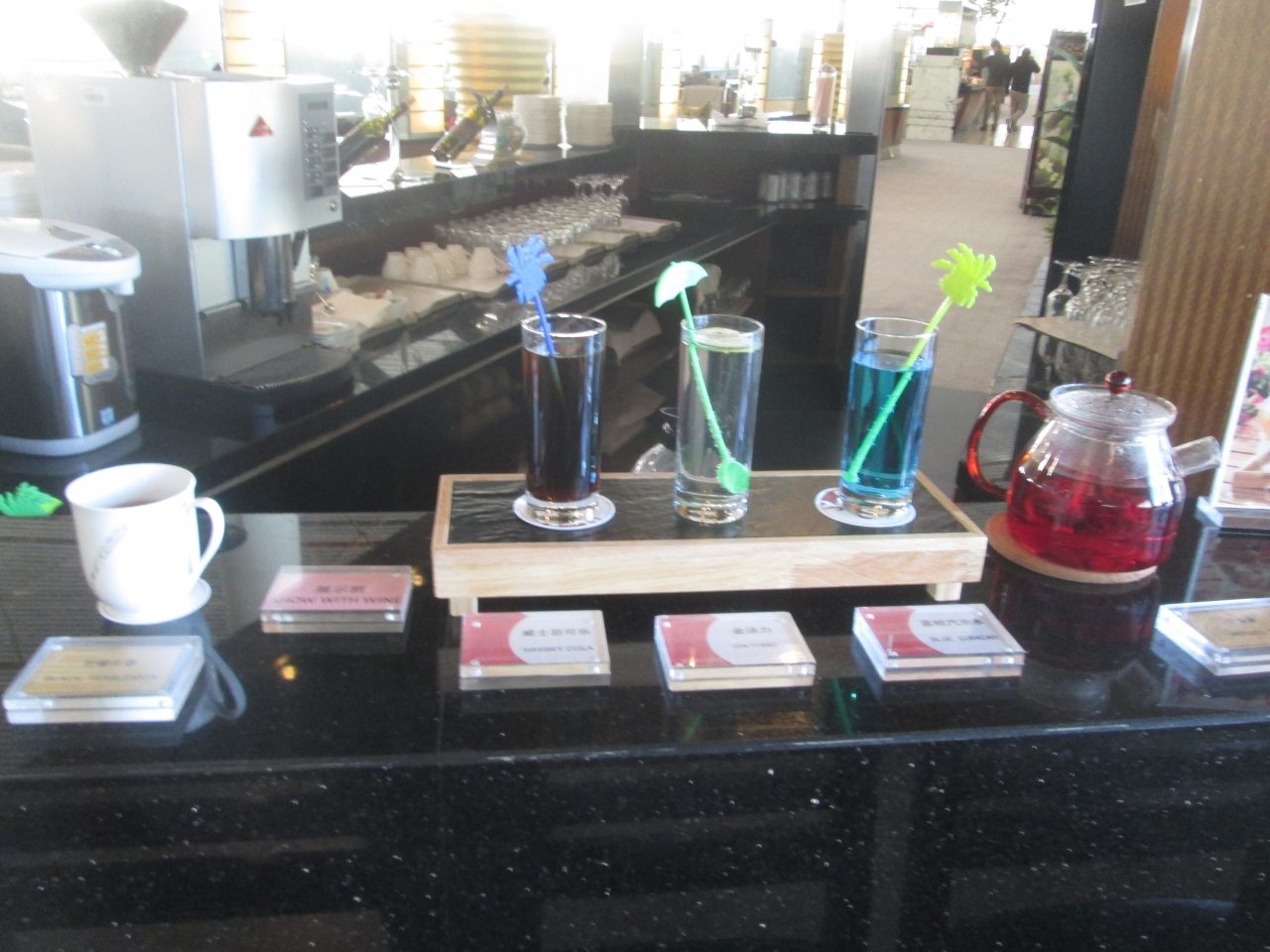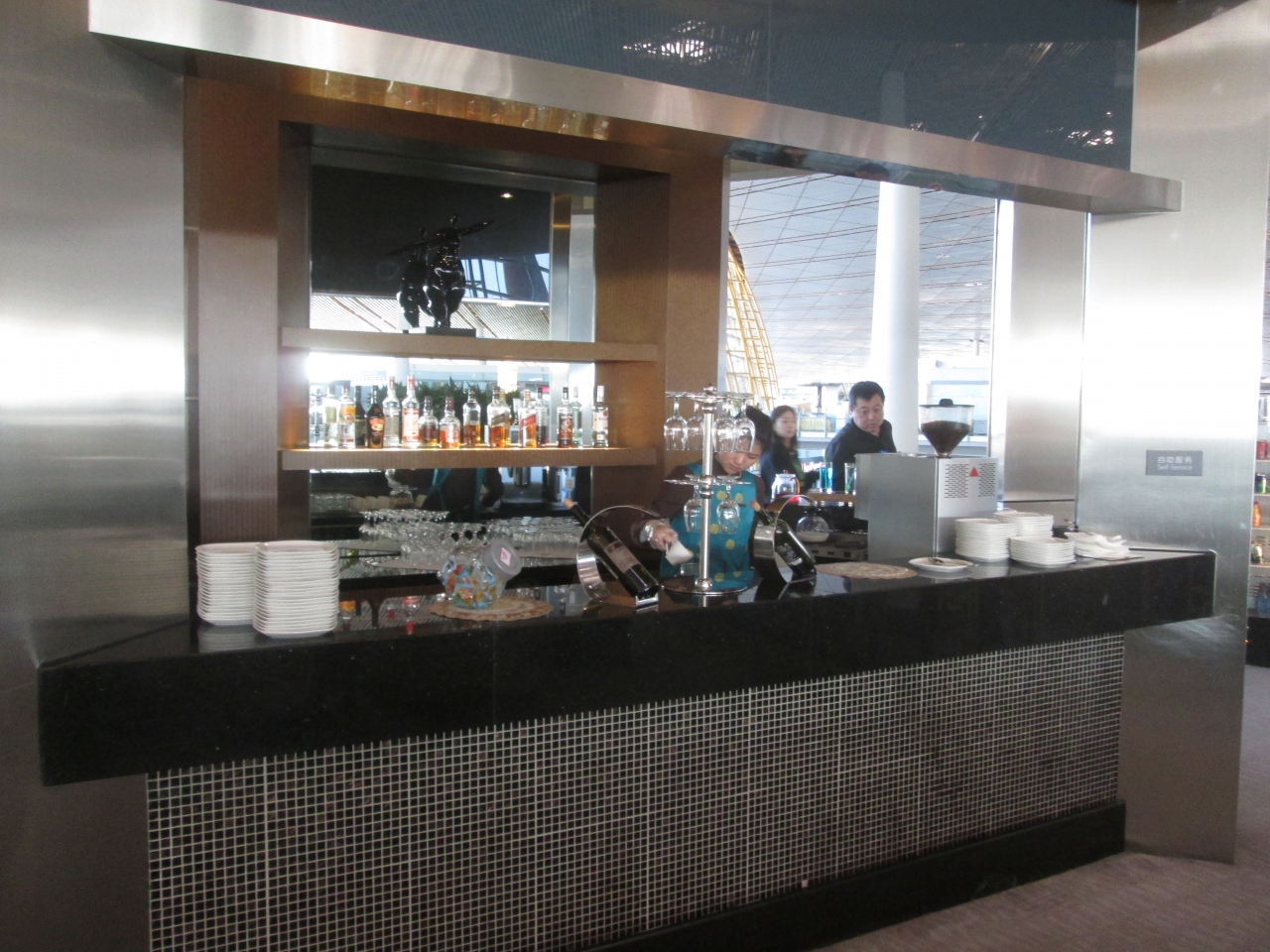 中國国際航空ファーストクラスラウンジにバーカウンターがありました。入口を入ってすぐのところに高級感漂うカウンターがありセルフでなく、スタッフに作ってもらうスタイルでした。こちらは、上級ステータスのラウンジでは当然のことなのかもしれませんが、サービスの良さを感じました。
