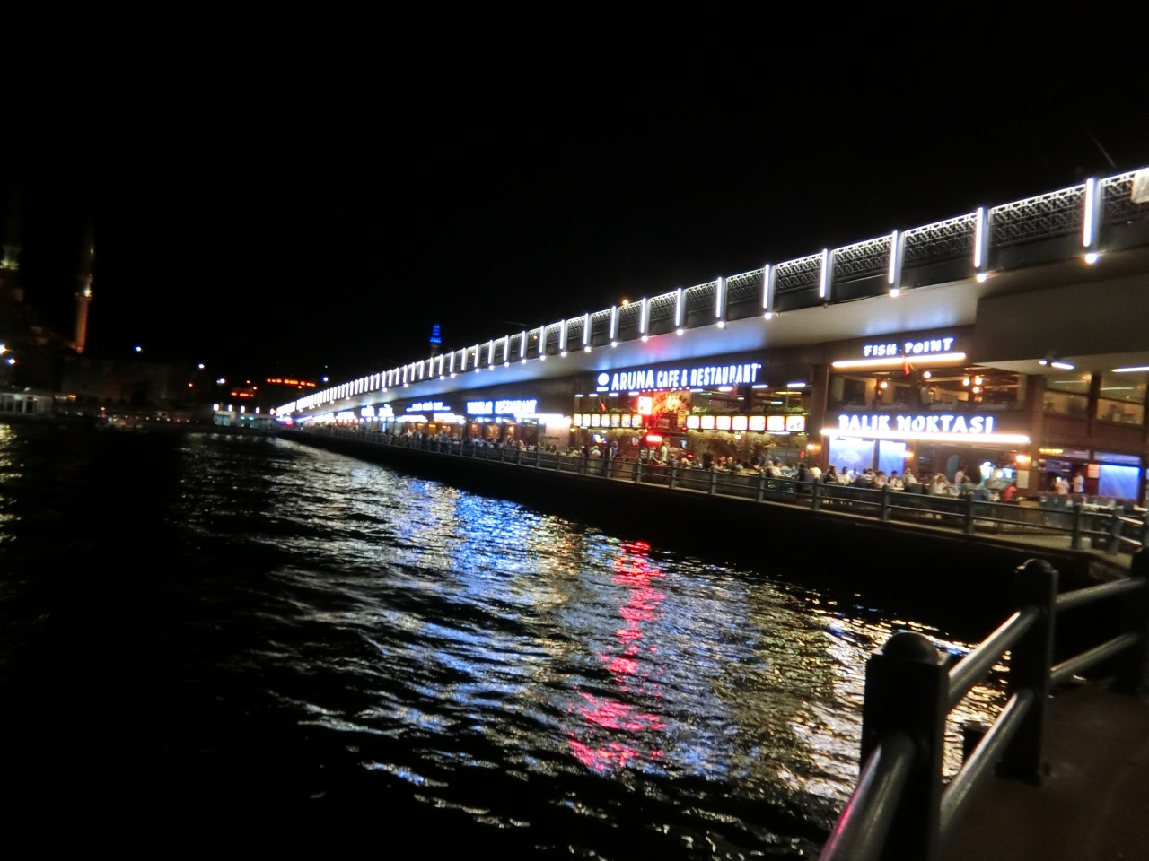 イスタンブールではガラク橋は有名な橋です。夜になるとライトアップされ、橋の下ではたくさんのレストランが連なり、有名なサバサンドなども売られています。遅い時間でもたくさんの人で賑わっています。橋から釣り糸を垂らして、多くの人が釣りをしているのが見られました。