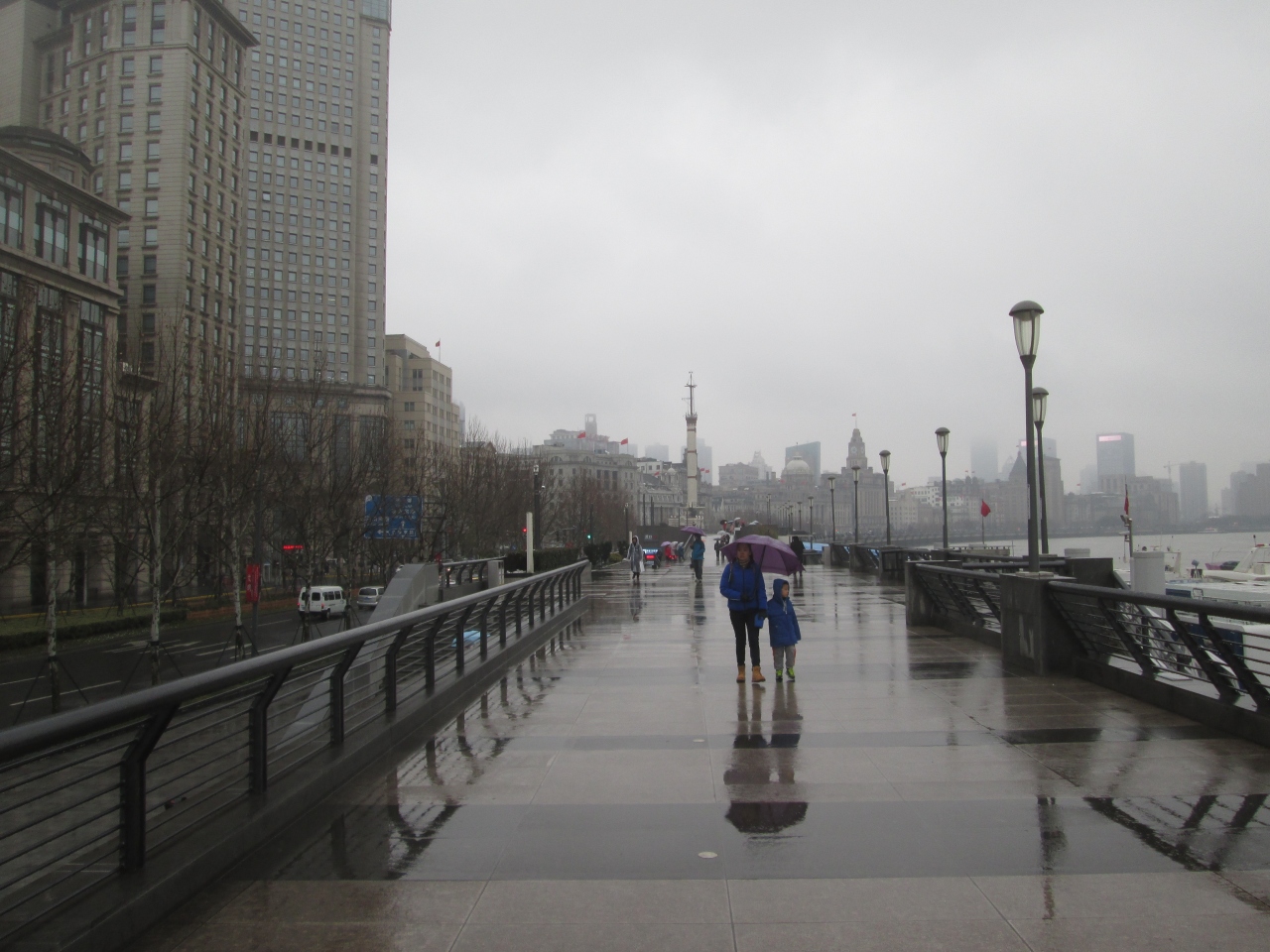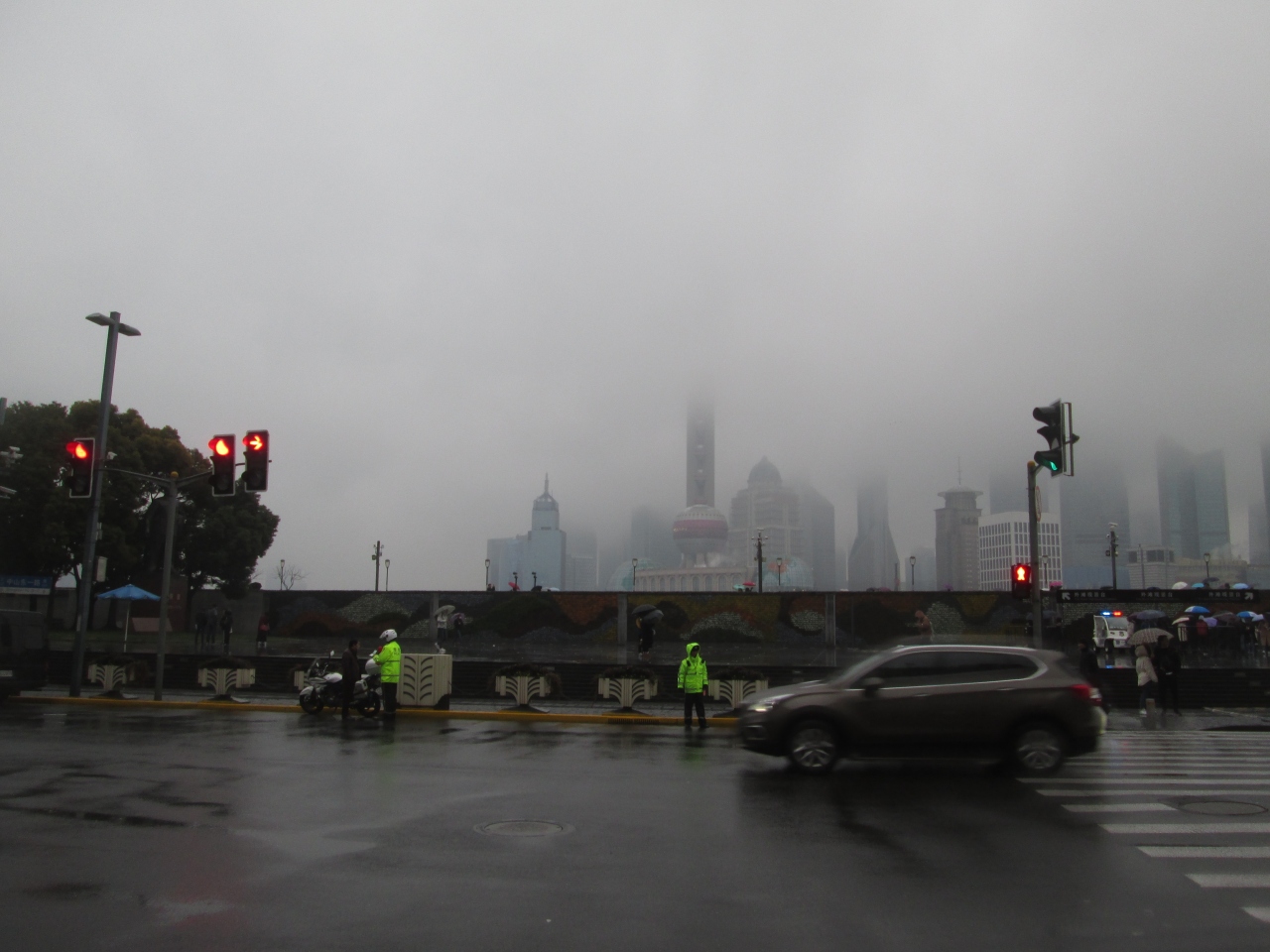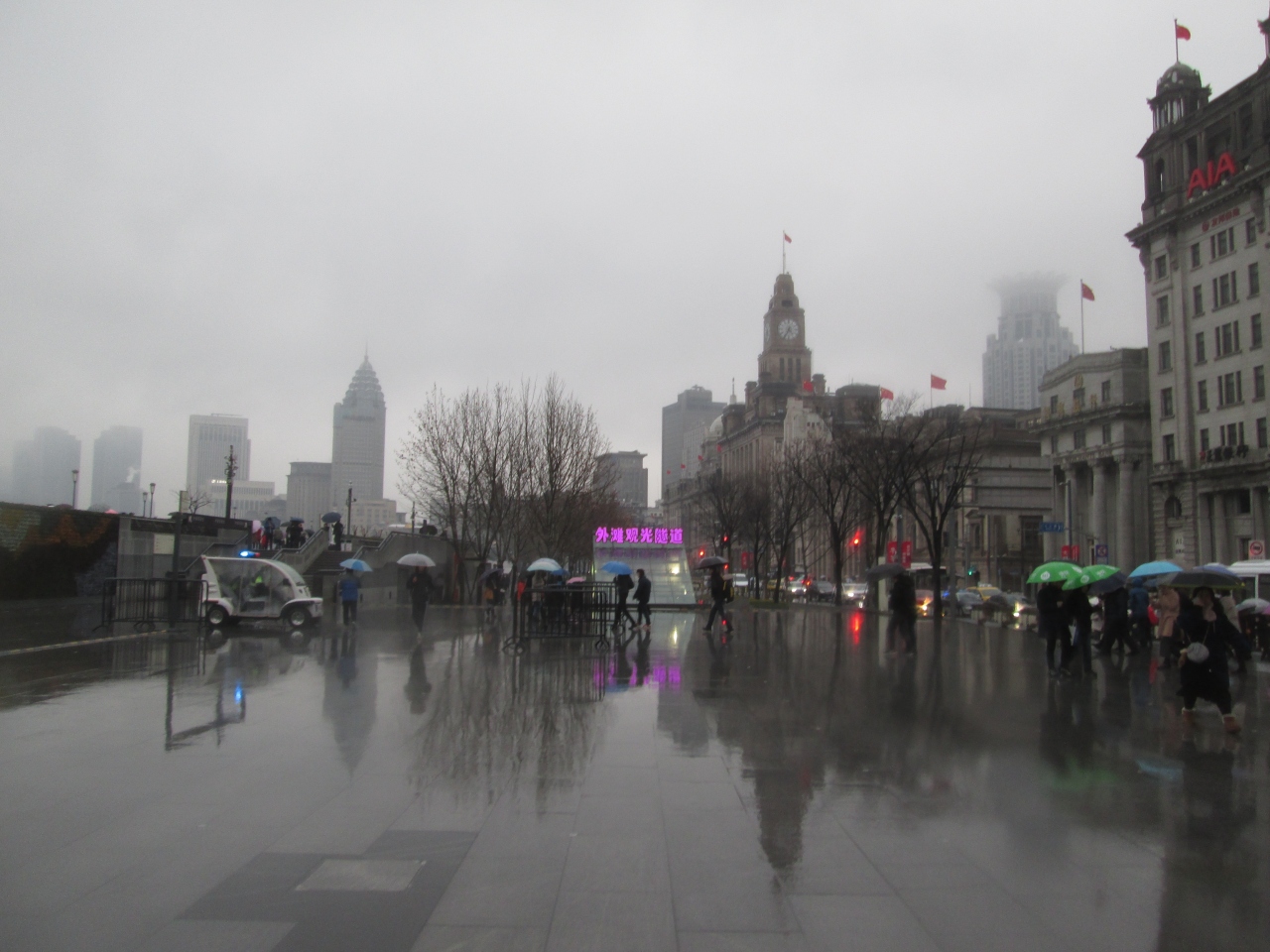 1月末の上海は天気が悪く、1日中、雪やみぞれまじりの雨が降り続く日がありました。足元が悪い状態で、外出したくないほど寒かった日でした。車が通行していくとしぶきが飛散してきましたが、それでも、傘をもちながら上海定番の景色を見学したり、記念撮影している観光客の人を見かけました。