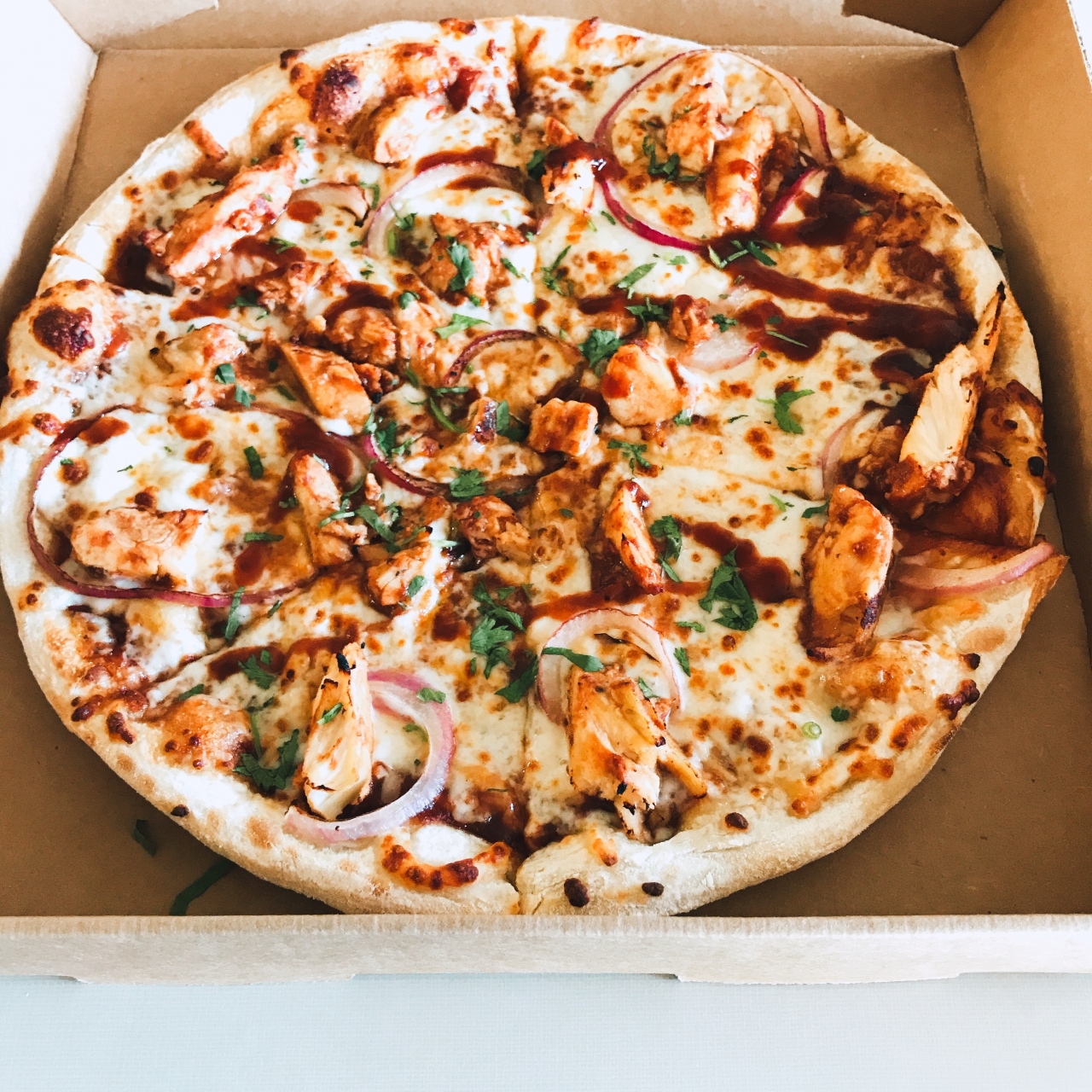 今回はワイキキのど真ん中にあるお店でテイクアウト(TO GO)を利用して、ホテルのラナイで頂きました。オーダーしたメニューは、いつもお決まりの「BBQチキン(バーベキューチキン)」。随分昔から何回も食べていますが、本当に食べ飽きない美味しさで、私にとってこれを上回るピザは未だに現れていません。