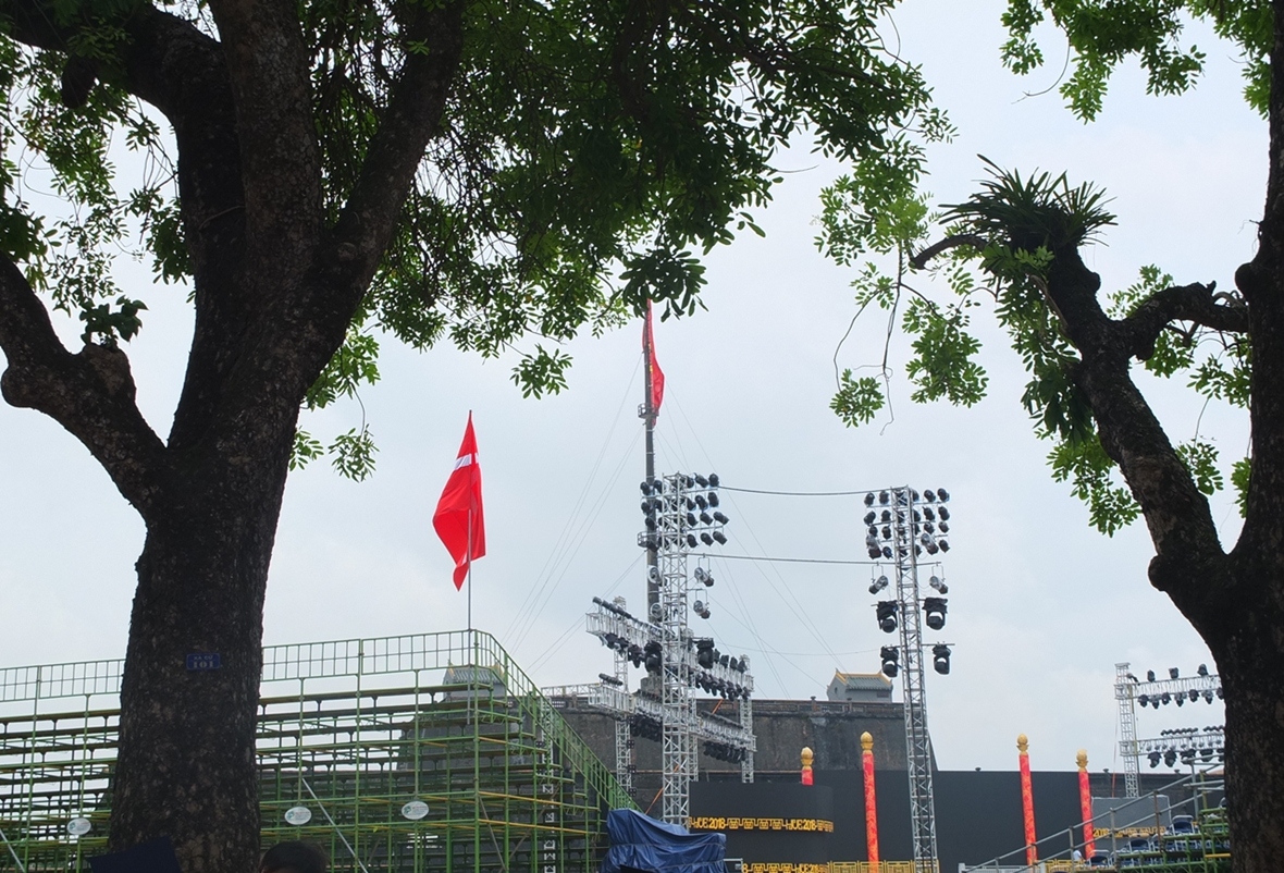王宮前広場のシンボルとなっている国旗掲揚台です。午門へ向かう途中で仰ぎ見ましたが近づく事は出来ませんでした。(特設ステージが組んでありました)かつては阮朝の国旗が掲げられていたそうですが 今はベトナム国旗がはためいていました。損傷を受ける度に修復を重ね現在の姿が有るようで、旗台にはベトナム戦争時の弾痕も残っているそうです。