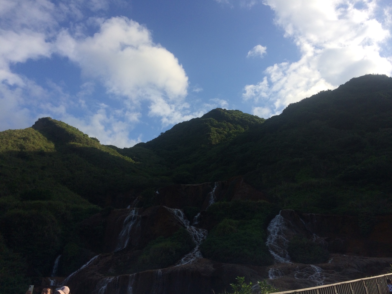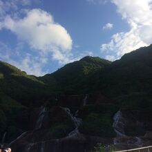 背景は山で茶壷山などの山が並びます。黄金瀑布のある場所からは、海は少ししか見えませんでした。滝の水は茶色くないのですが、水が流れる岩が赤茶色になっているので、透明の水が太陽の光を浴びると金に見えるので、この名前のようです。