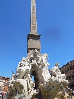 ベルニーニ作「四大河の噴水」は、ナヴォーナ広場の中央にある噴水です。四つの大陸を代表する大河…アフリカ=ナイル川、アジア=ガンジス川、ヨーロッパ=ドナウ川、南アメリカ=ラプラタ川を擬人化した男性像がオベリスクの周りに施されています。彫刻の素晴らしさは一見の価値があります。
