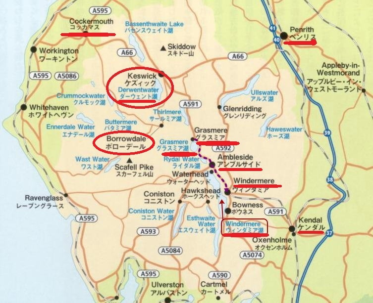 8月10日、もう1泊したかったDroitwich Spaドロイトウィッチ・スパのThe Chateau Impney Hotelシャトー・インプネー・ホテルを10時半に発ち、Birminghamバーミンガム、Manchesterマンチェスター、Lancasterランカスターと北上して、A6・A591でLake District湖水地方の入口Kendalケンダルを経由、Windermere Lakeウィンダミア湖を左に見ながら走る。ウィンダミア、Amblesideアンブルサイト、Grasmereグラスミア湖・グラスミアの町を過ぎると、A591の終点になるKeswickケズウィック(人口5千人)に至った。