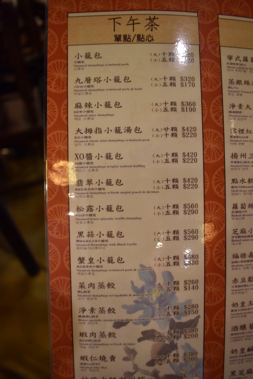 普通の小籠包の他にも。バジル小籠包、トリュフ小籠包、ピリ辛小籠包、XO醤小籠包、海老とヘチマ小籠包、黒にんにく小籠包、蟹ミソ小籠包。すごいのは奇をてらったのではなくちゃんとそれぞれの小籠包がおいしいところ。