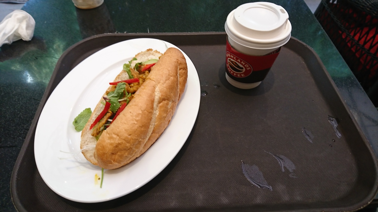 ピーチティー(ホット)とバインミーを注文しました。ピーチティーは甘さの加減がちょうどよく、美味しかったです。バインミーは豚肉がニンニクで味付けされていて良かったですが、香草が入っていたのが気になりました。