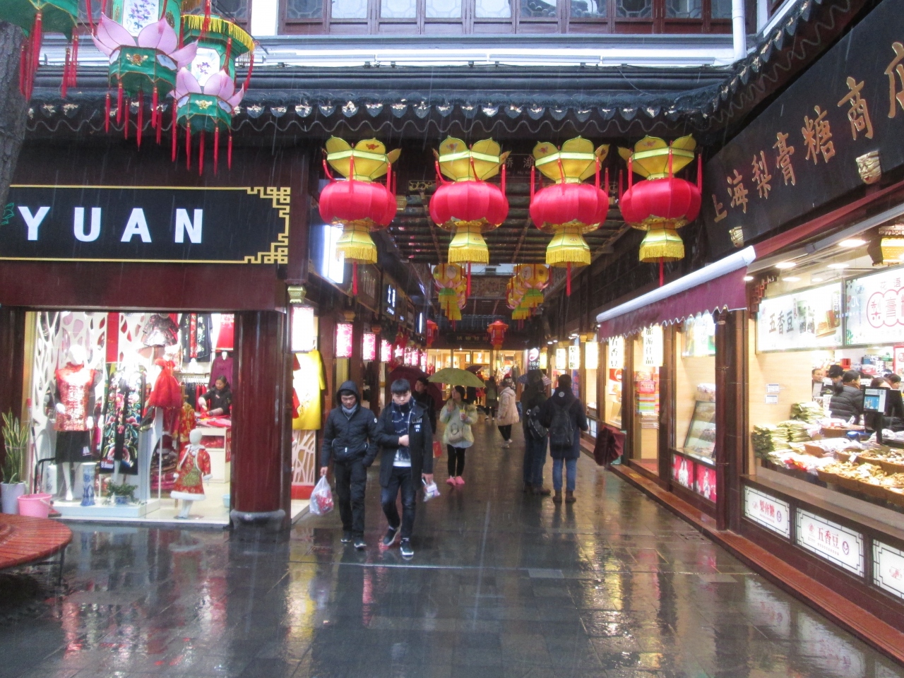 冬の上海は暖かいという印象でしたが、1月の上海は甘く見ていました。滞在した3日間に雪やみぞれが降り非常に寒かったです。それでも、豫園商城のアーケード内はエアコンが利いており、アウターなしでも見学できるくらい快適でした。真冬の上海は商店街めぐりが最適です。