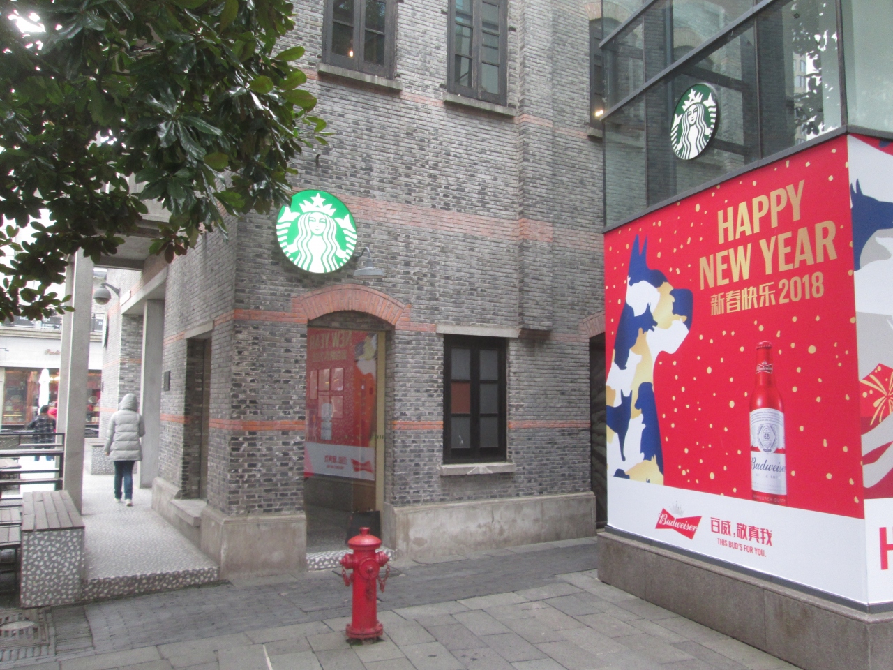 旧正月シーズンの新天地に訪問しました。星巴克珈琲の入口には赤色を基調にした旧正月を祝う飾りがありました。2018年は犬年ということで、飾りには犬が付いていました。日本では見かけない限定ドリンクの容器があり珍しかったです。本旧正月まで半月ほど時間がありますが、中国では特別なイベントのようです。